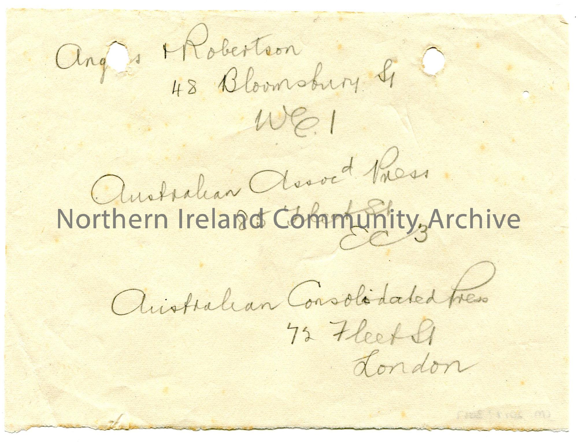 Handwritten notes in pencil of three addresses. Mentions Angus Robertson, 48 Bloomsbury Square, Australian Associated Press, 85 Fleet Street [London] …