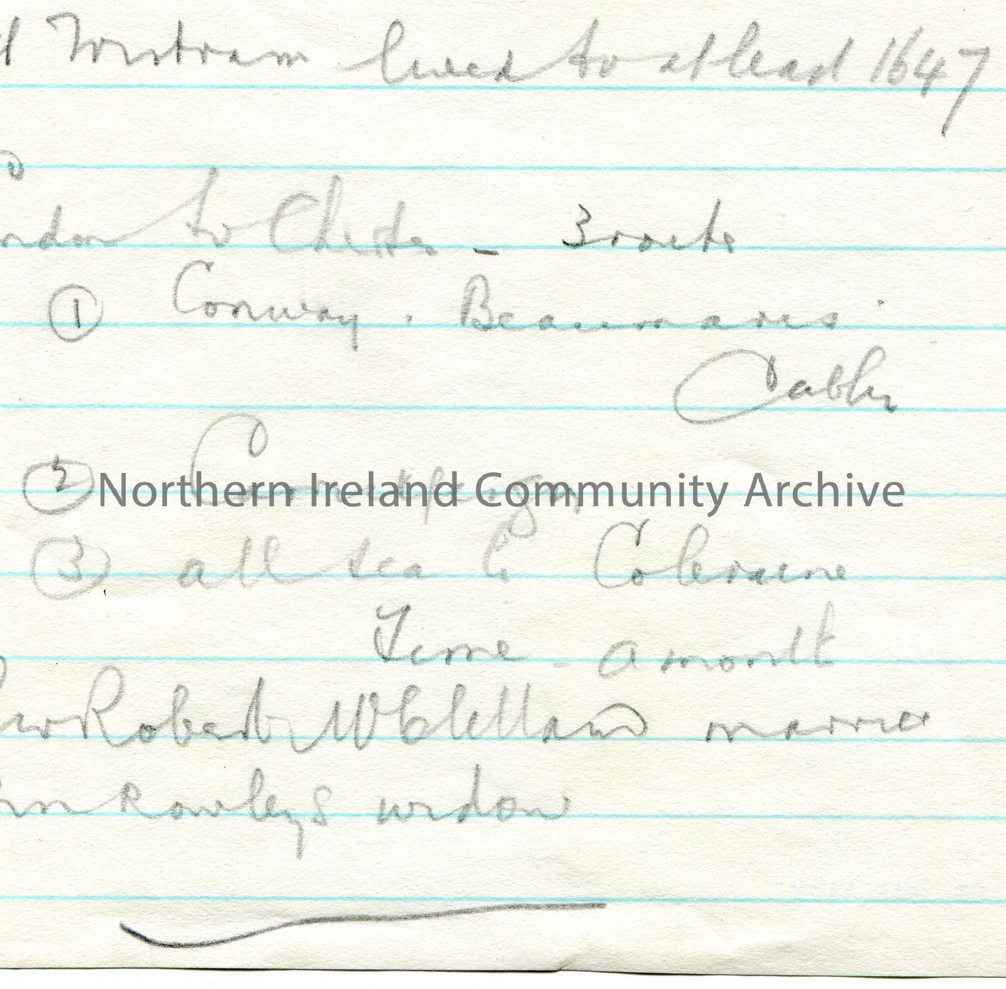 Handwritten notes in pencil on lined paper. Not in context. Mentions Conway, Carrickfergus and Coleraine. Notes that Sir Robert McClelland married Joh…