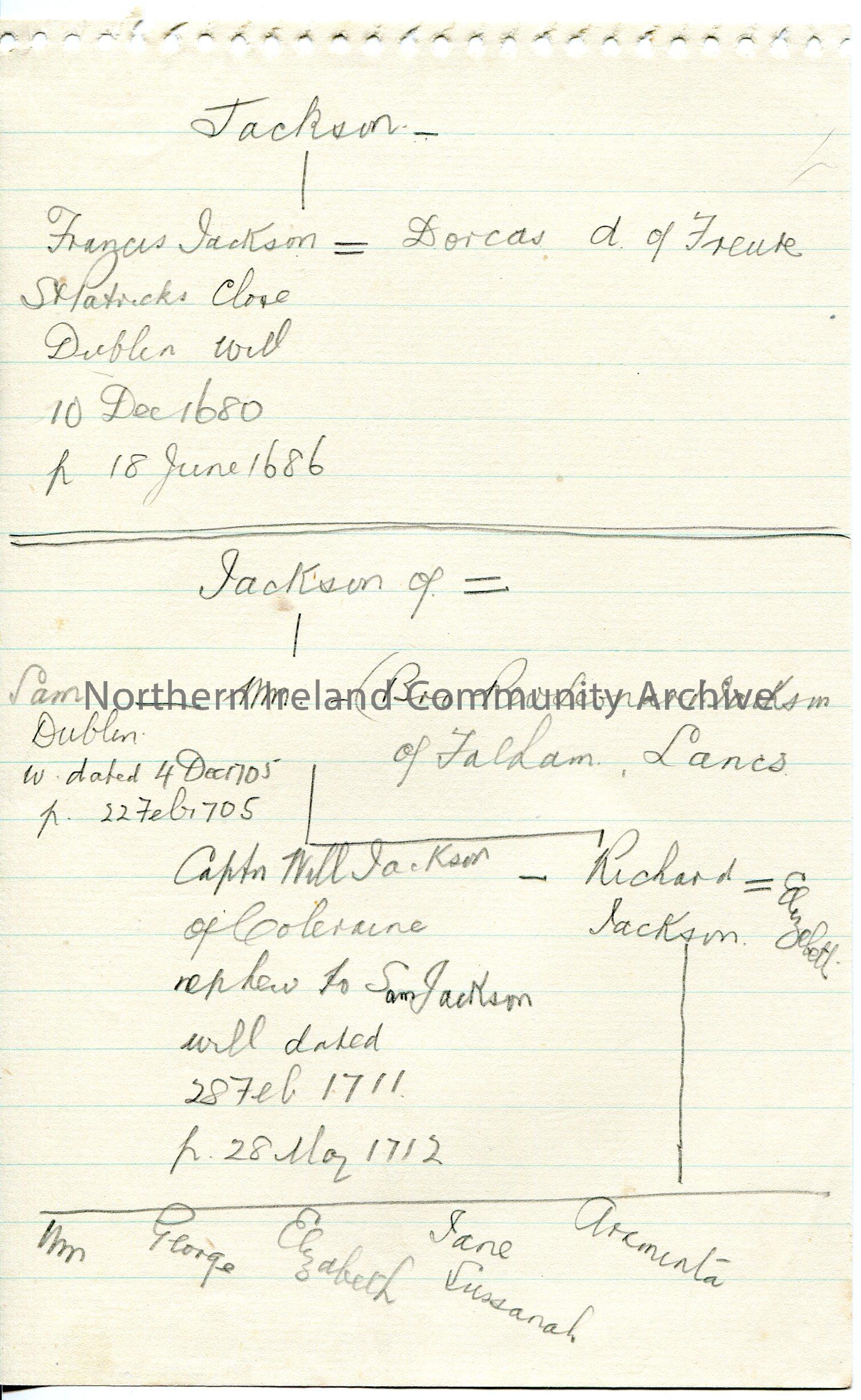 Handwritten notes in pencil on lined paper of family tree of Jackson family.