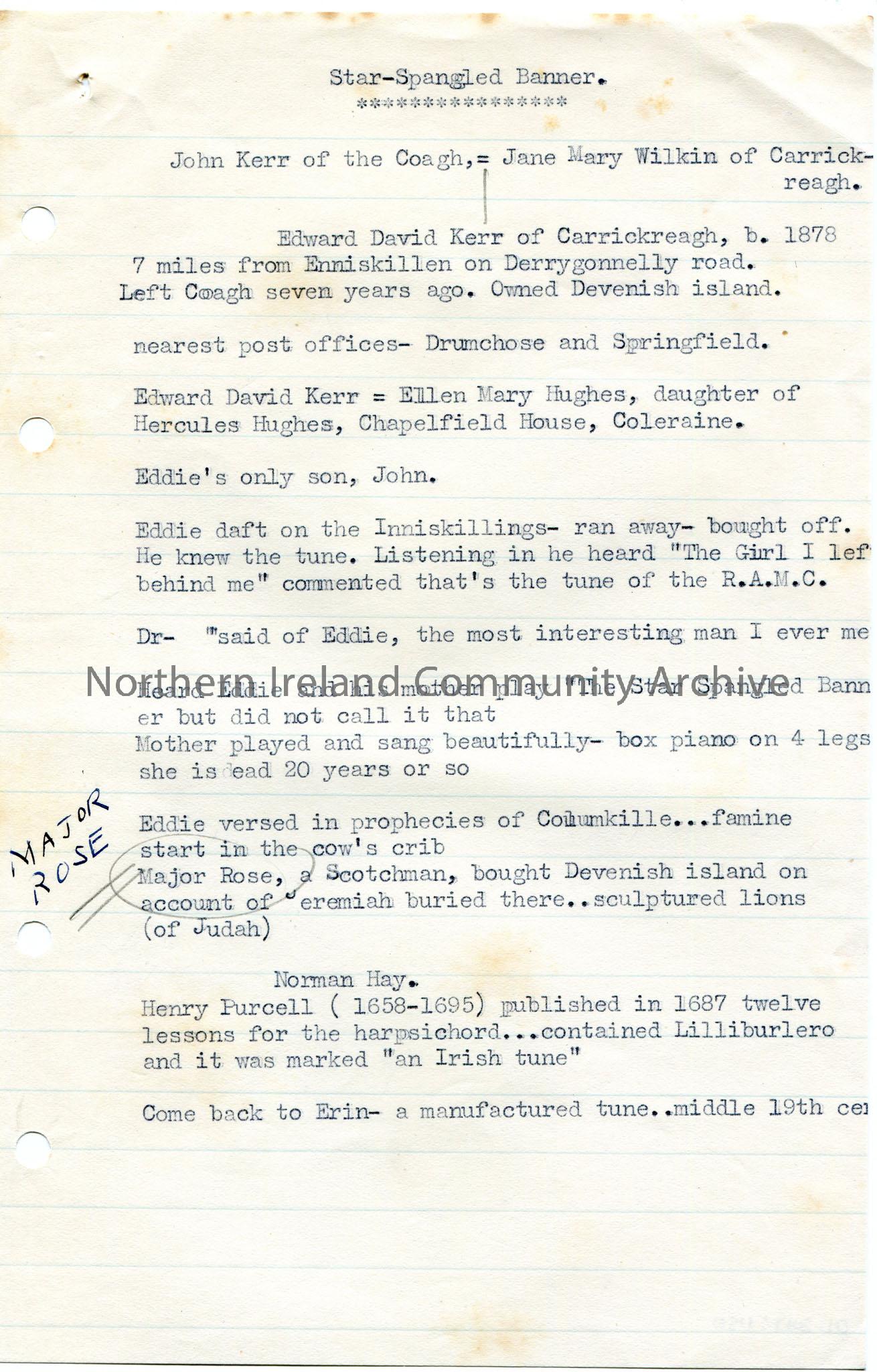Handwritten notes in pencil on lined paper titled, ‘Star-Spangled Banner’. Kerr genealogy. ‘Major Rose’ circled and written in ink to side of notes.