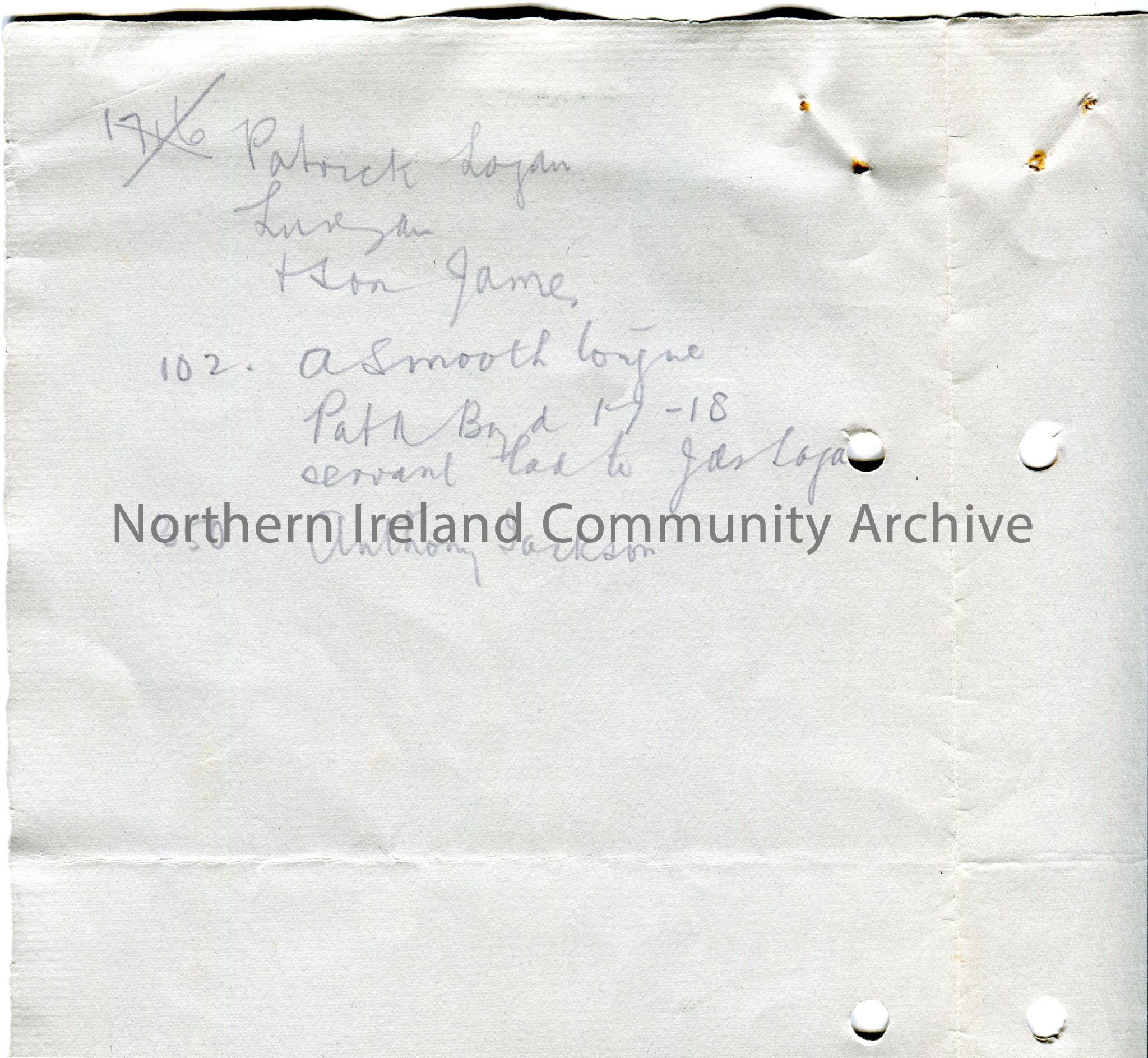 Handwritten notes in pencil on paper which is folded. Mentions surnames Edmundson, Logan and Jackson. Mentions place name Lurgan. Biblical reference on back of page.
