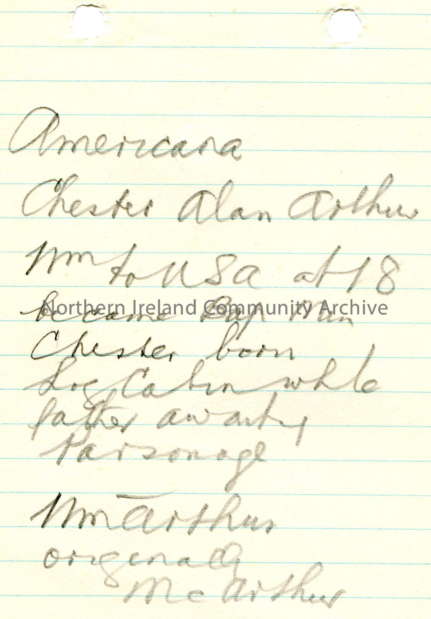 Handwritten notes in pencil on small piece of lined paper re genealogical information Chester Alan Arthur.