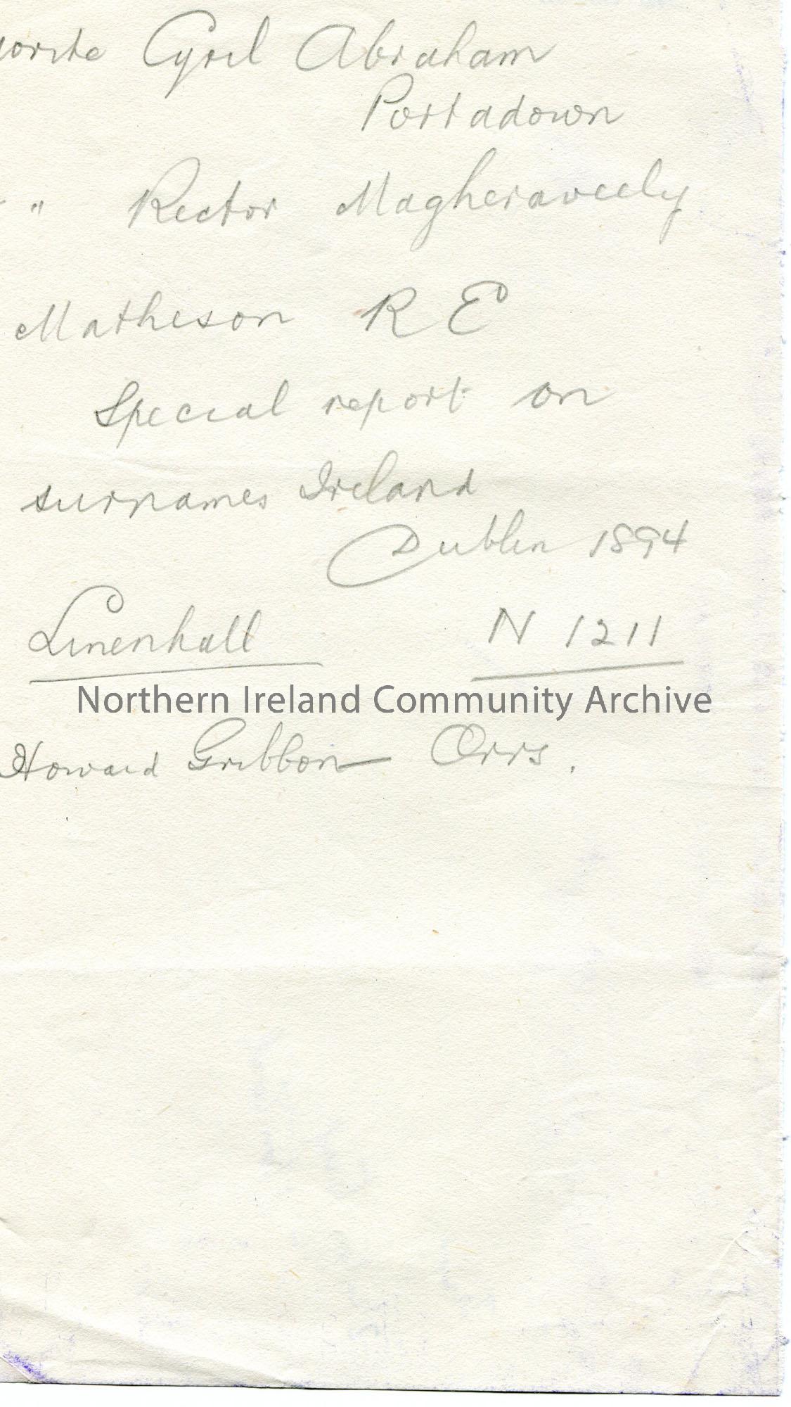 Handwritten notes in pencil re Abraham genealogy. Rough note re weight of turf and coal on back of page.
