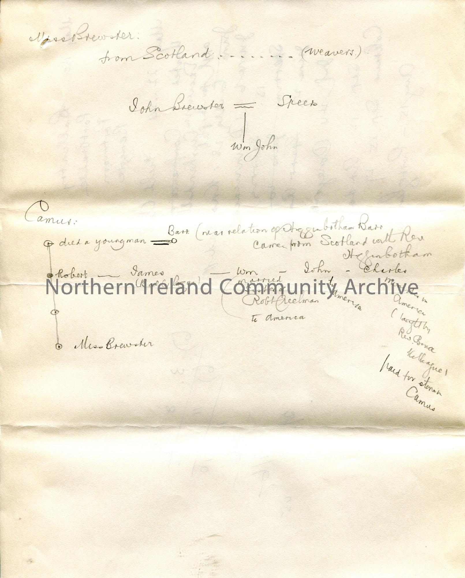 Handwritten notes in pencil re Brewster family. Other side of page is a list of dates and places presumably where Sam Henry was on these dates.