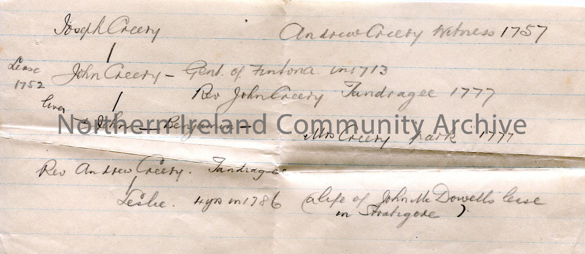 Handwritten notes in pencil re Creery family of Fintona. Dates refer to 18th century.