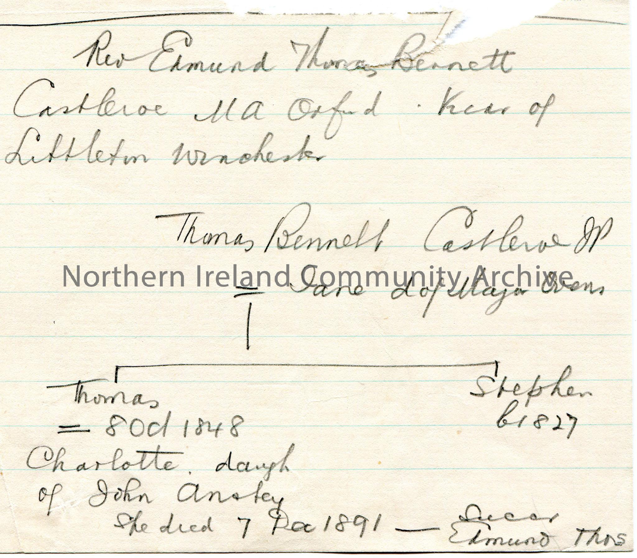 Handwritten notes in pencil re genealogical information of the name Bennett. Page ripped in half from larger page.