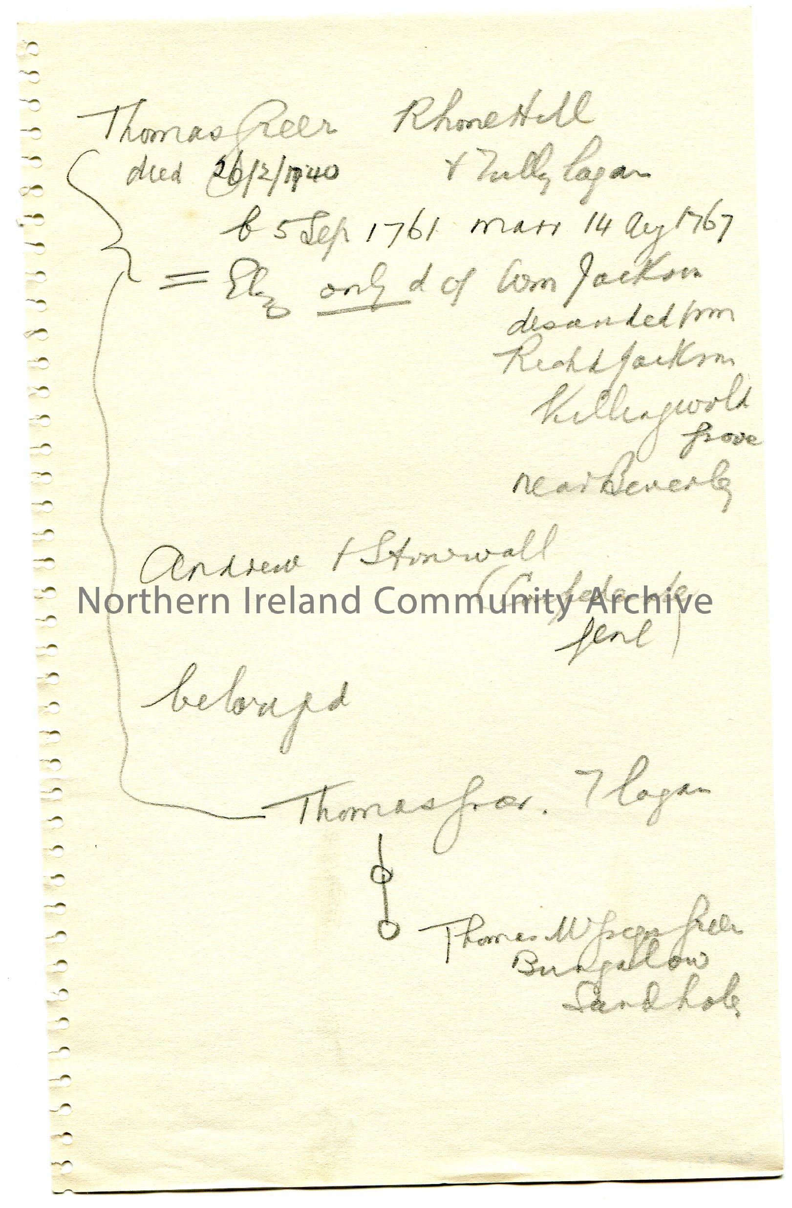 Handwritten notes in pencil re genealogical information – Thomas Greer – Wm [William] Jackson – Andrew and Stonewall.