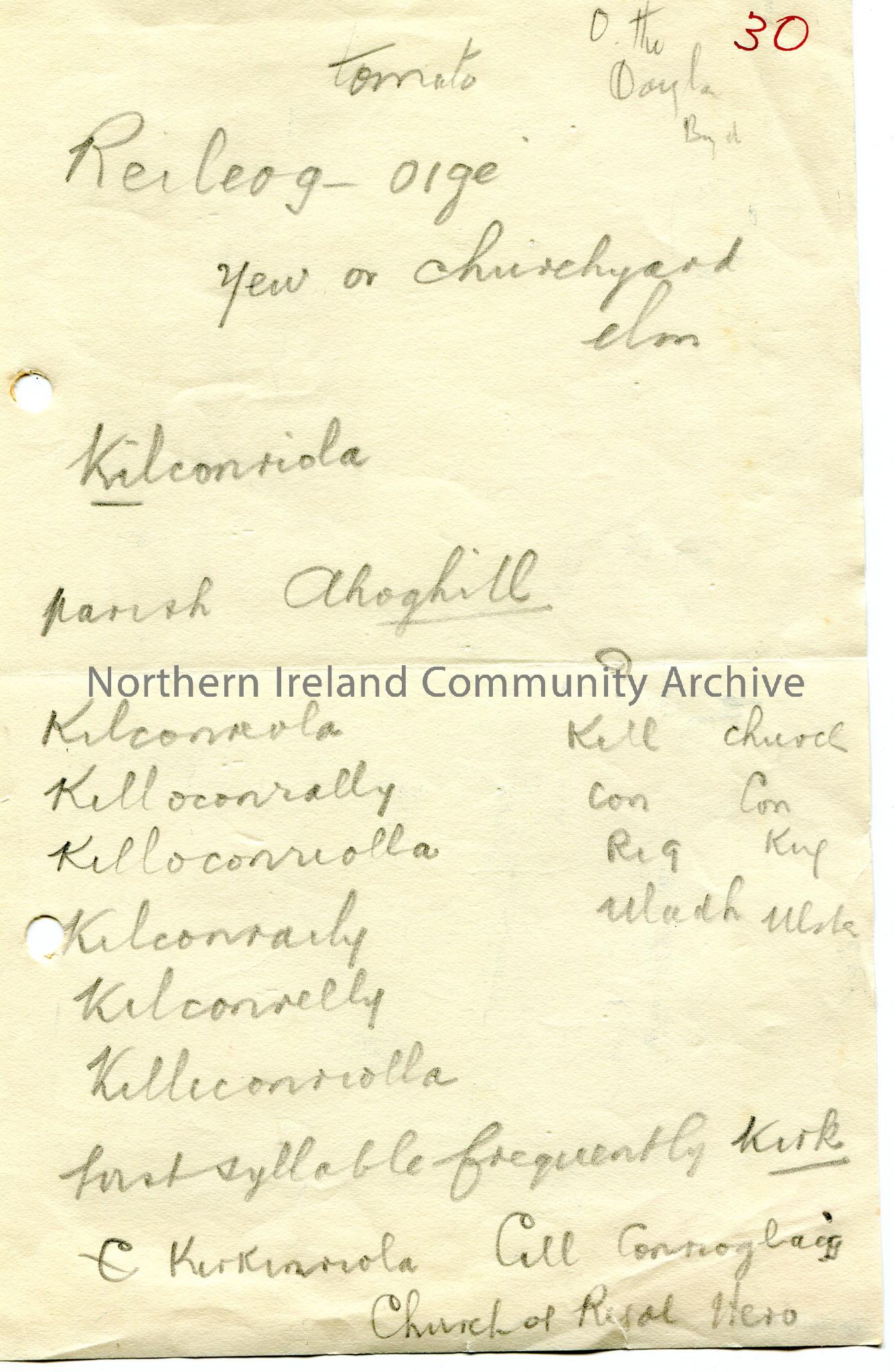 Handwritten notes in pencil re Kilconriola. Includes different variations of the spelling of the parish. Number ’30’ written in red top corner of page…