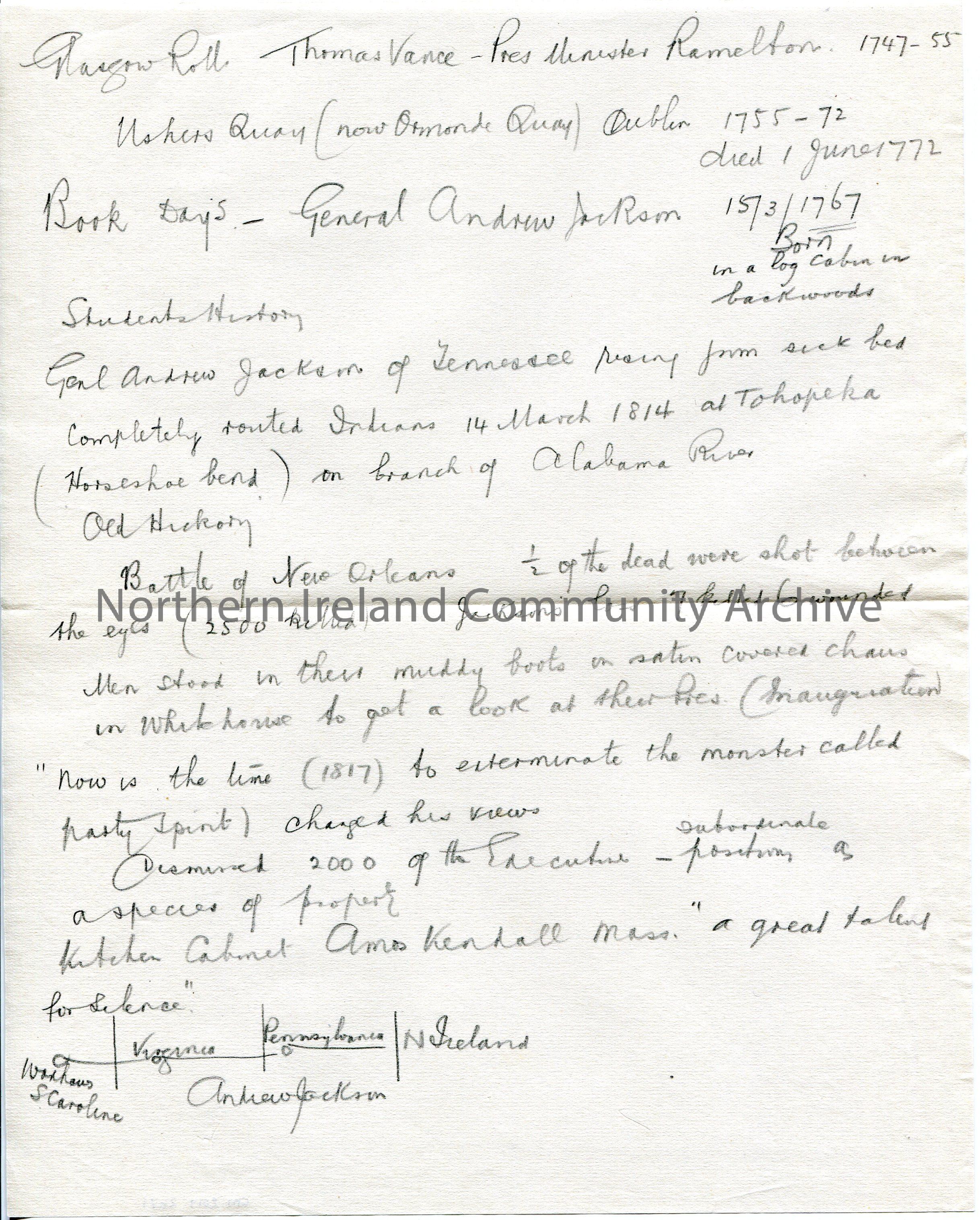 Handwritten notes in pencil re research of Thomas Vance and General Andrew Jackson. Give brief results of the Battle of New Orleans.