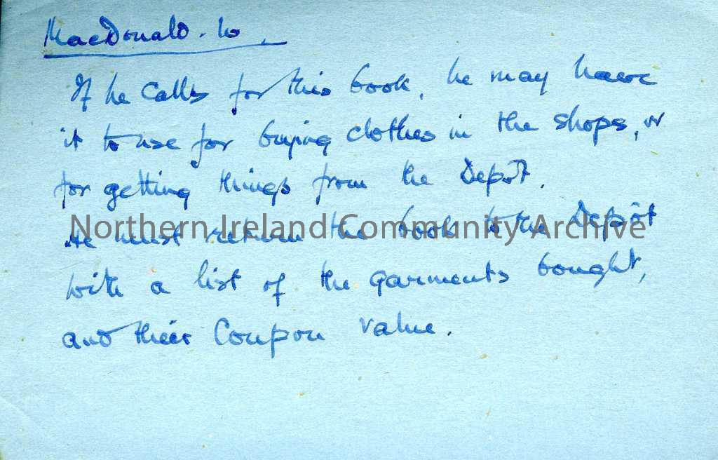 Handwritten notes left as information for others, one is regarding MacDonald collecting his coupons, another is about parcels, one has sums written on…