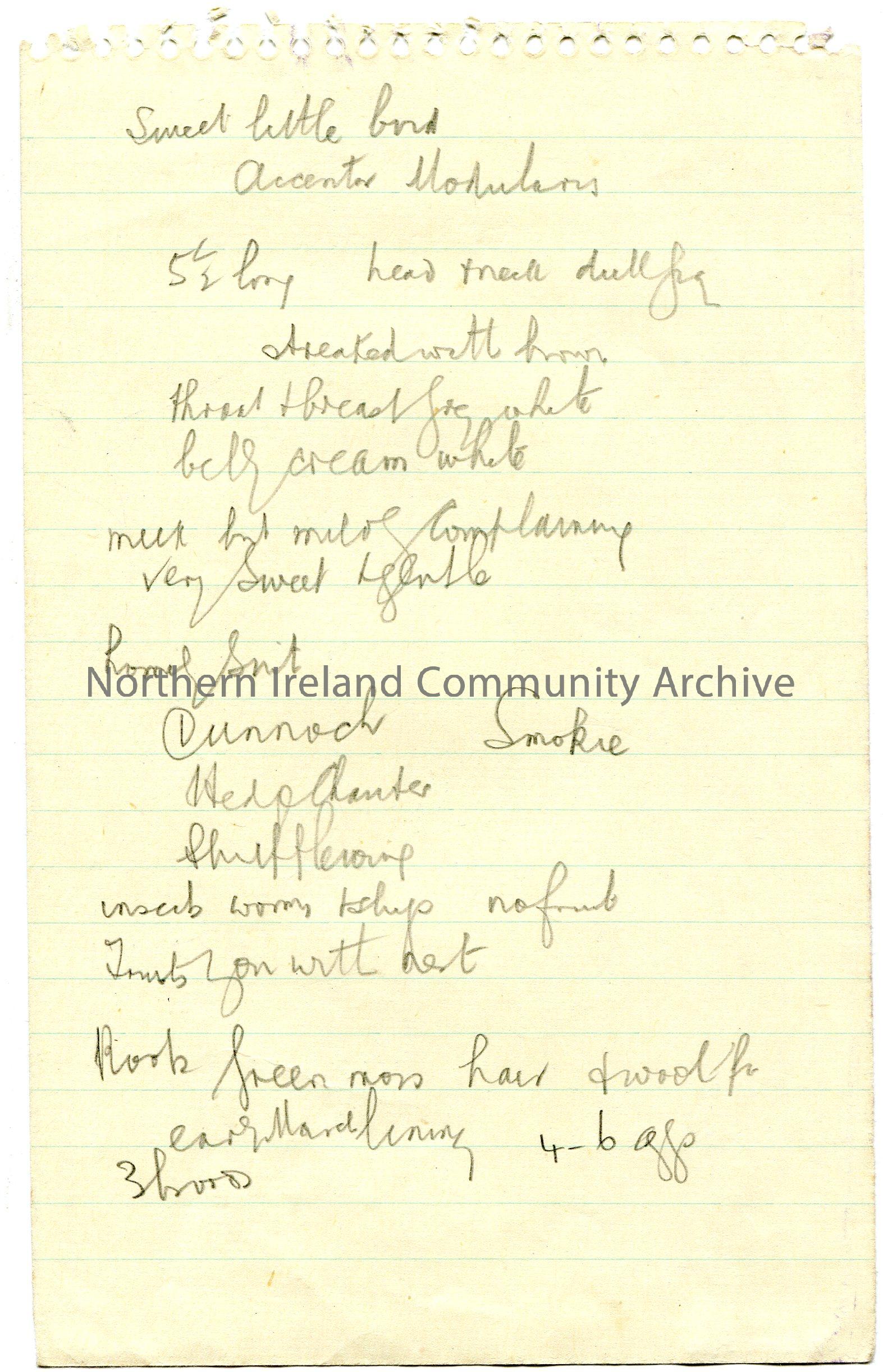Handwritten notes on lined paper (perforated along top edge) re birds. Notes not in context. Begins with sweet little bird…