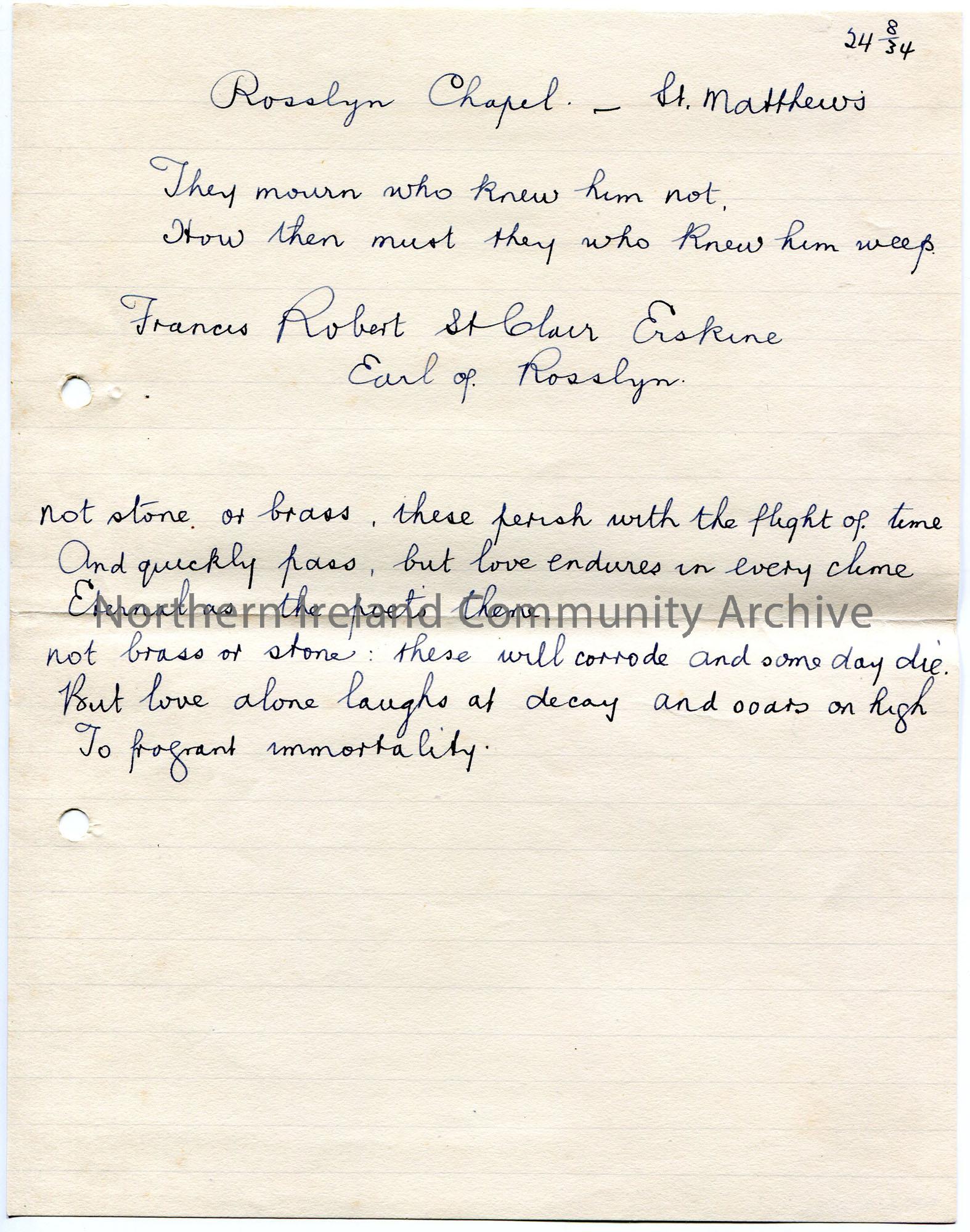 Handwritten notes on lined paper titled, ‘Rosslyn Chapel – St Matthews’. Mentions Francis Robert St Clair Erskine, Earl of Rosslyn.