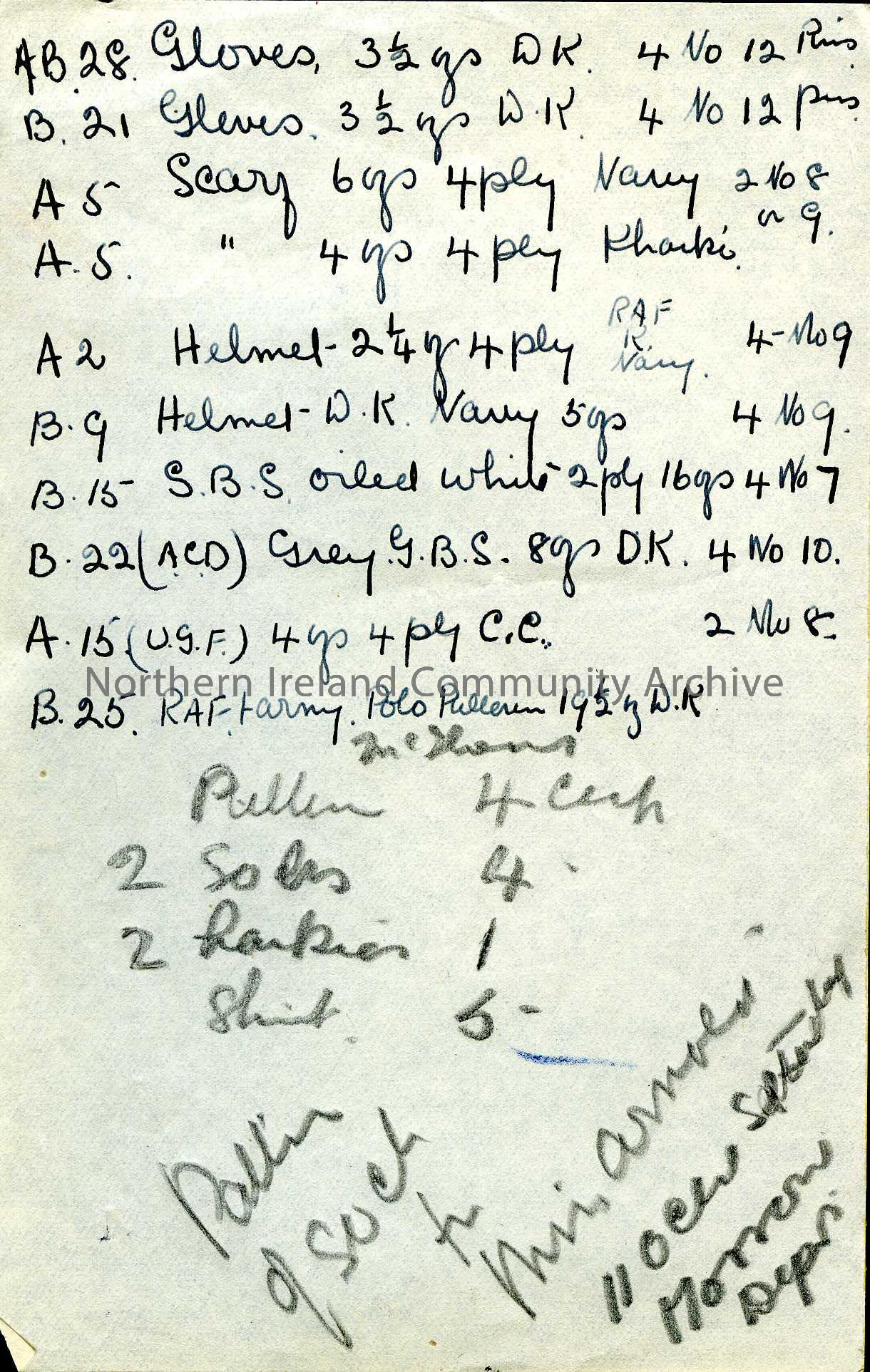 Handwritten notes on scraps and small pieces of paper. All related to knitting and includes a list of ladies who are knitting for members of the servi… – 192B