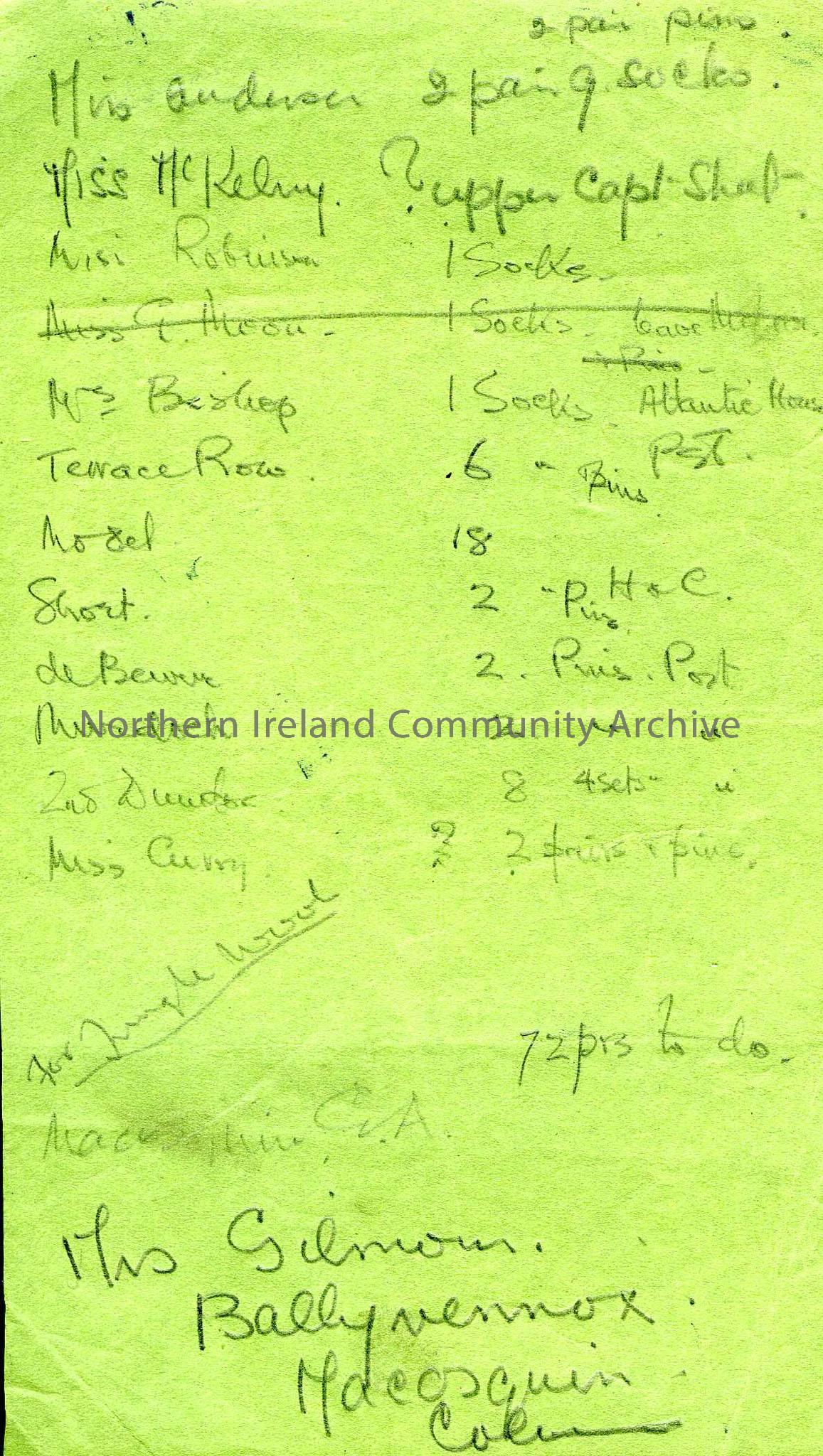 Handwritten notes on scraps and small pieces of paper. All related to knitting and includes a list of ladies who are knitting for members of the servi… – 192C