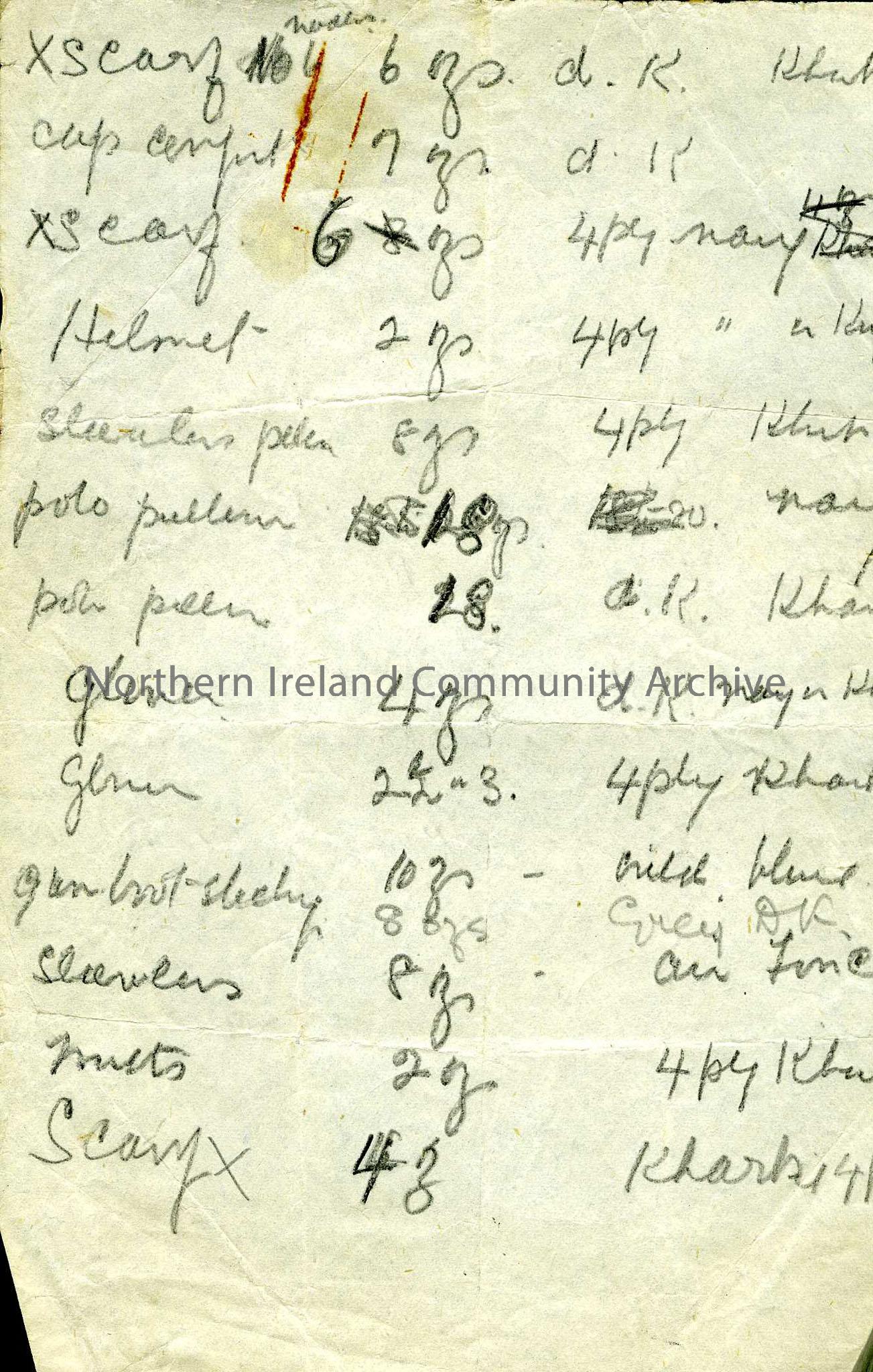 Handwritten notes on scraps and small pieces of paper. All related to knitting and includes a list of ladies who are knitting for members of the servi… – 192D