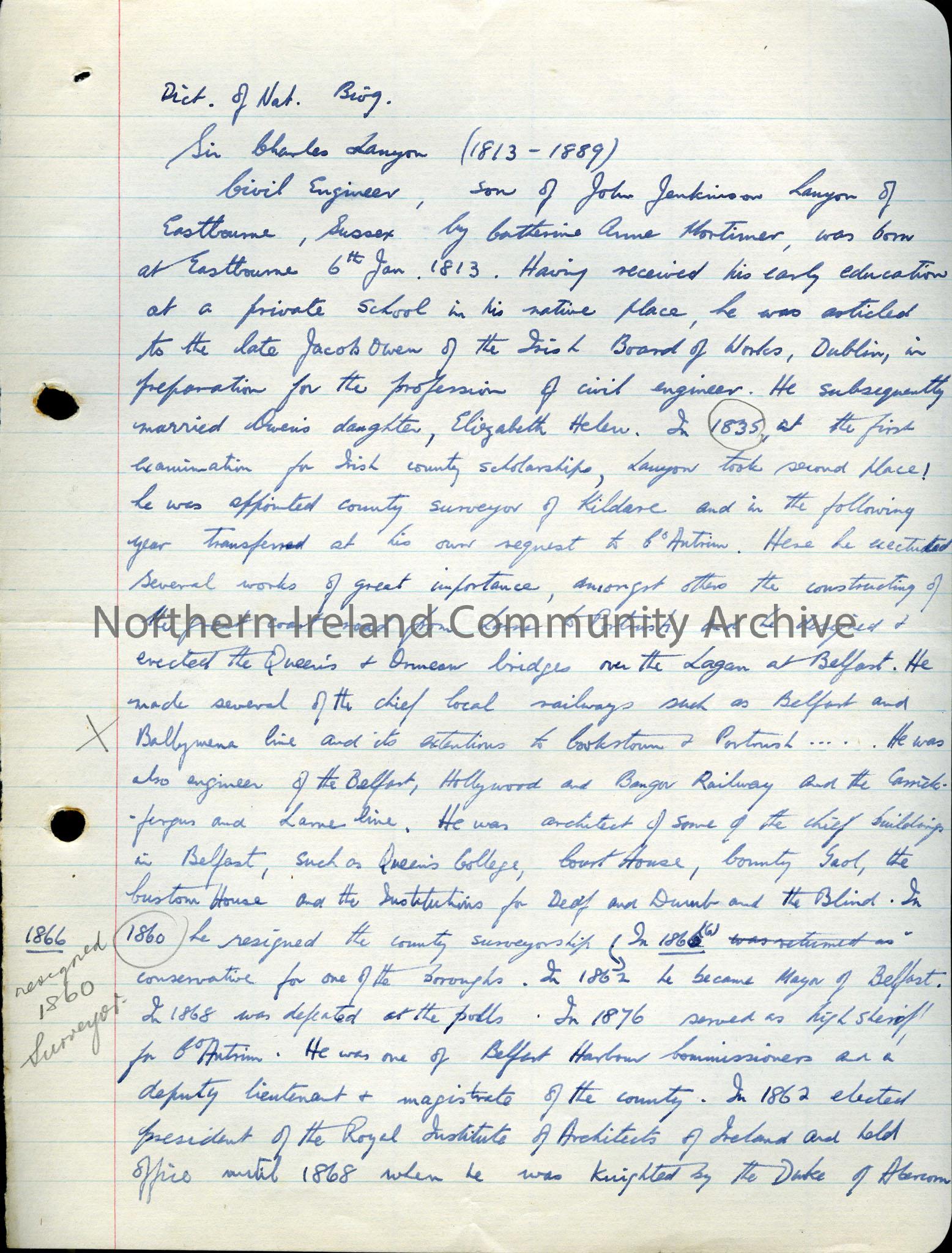 Handwritten notes on the life and career of Sir Charles Lanyon taken from the Dictionary of National Biography.