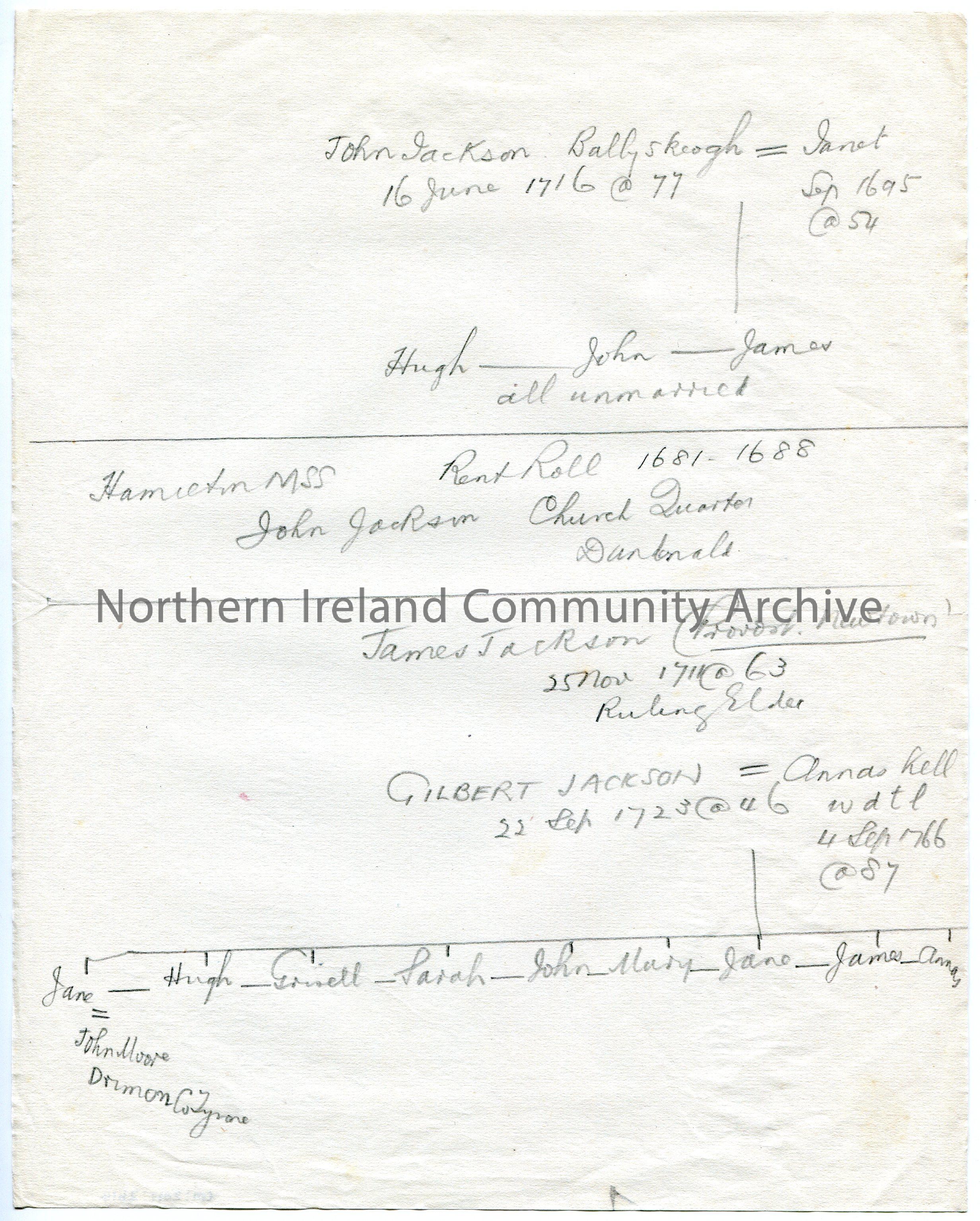 Handwritten notes re genealogical information re members of the Jackson family. Mentions John Jackson, Ballyskeogh; James Jackson and Gilbert Jackson.