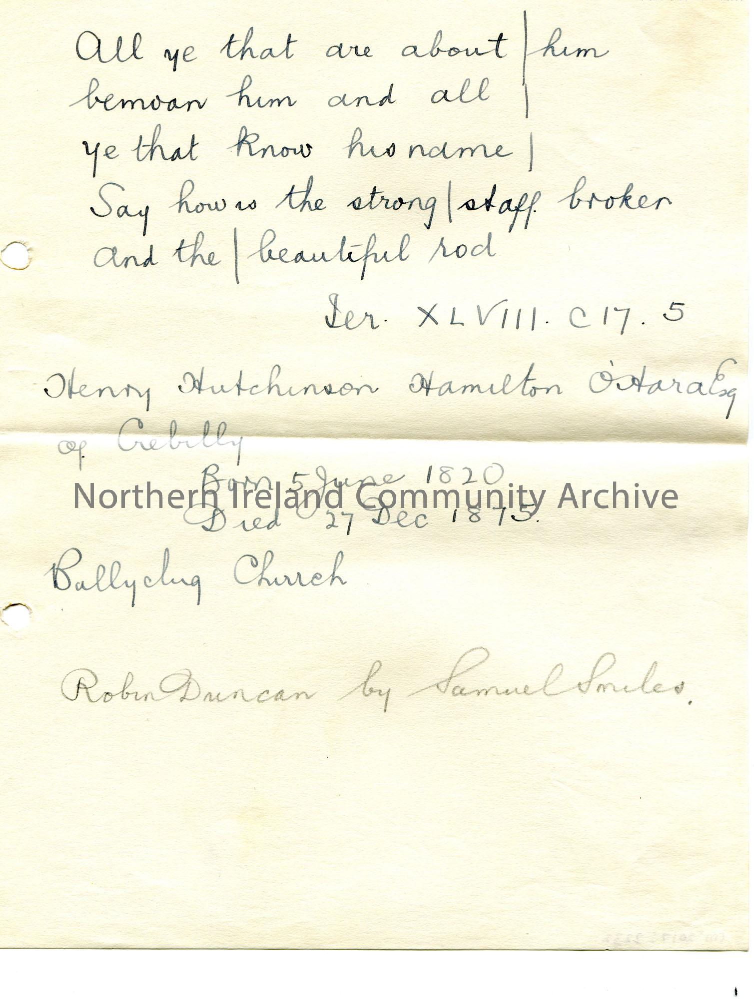 Handwritten notes re Henry Hutchinson Hamilton O’Hara or Crebilly.