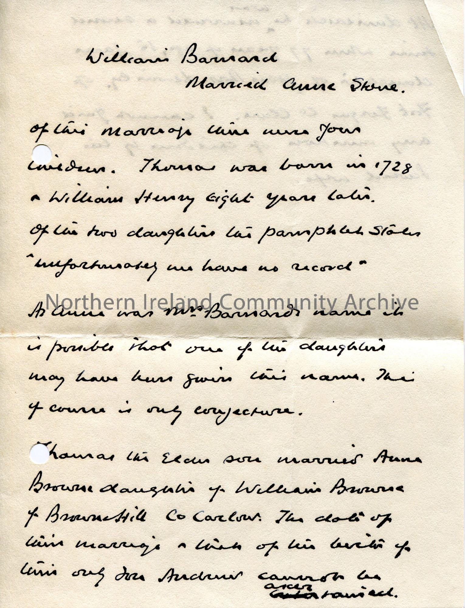 Handwritten notes re marriage of William Barnard to Anne Stone.