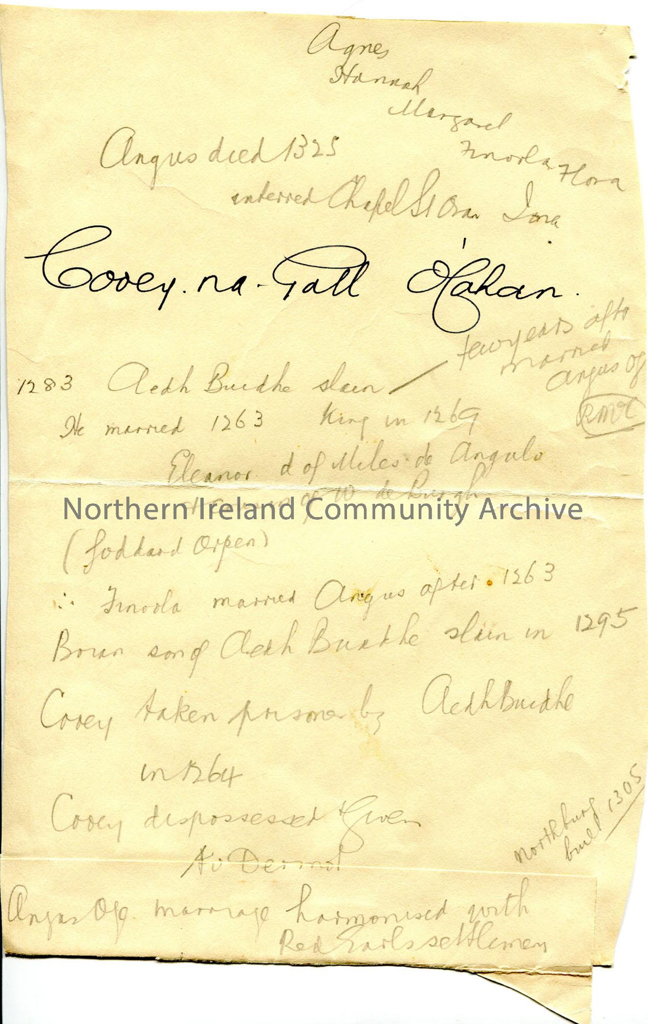 Handwritten notes re O’Cahan family – notably Cooey na Gall O’Cahan.