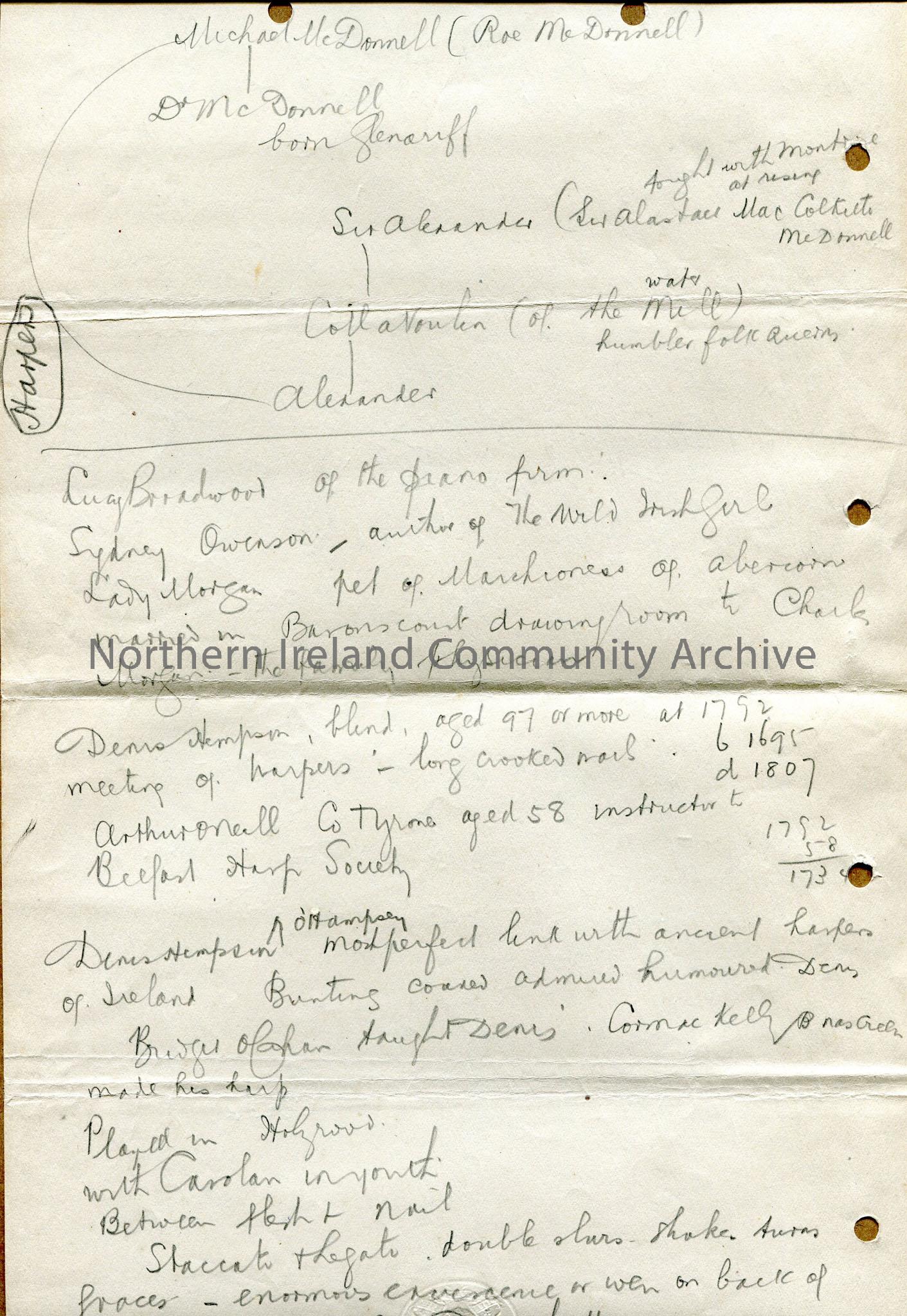 Handwritten notes re various harpers, including...
