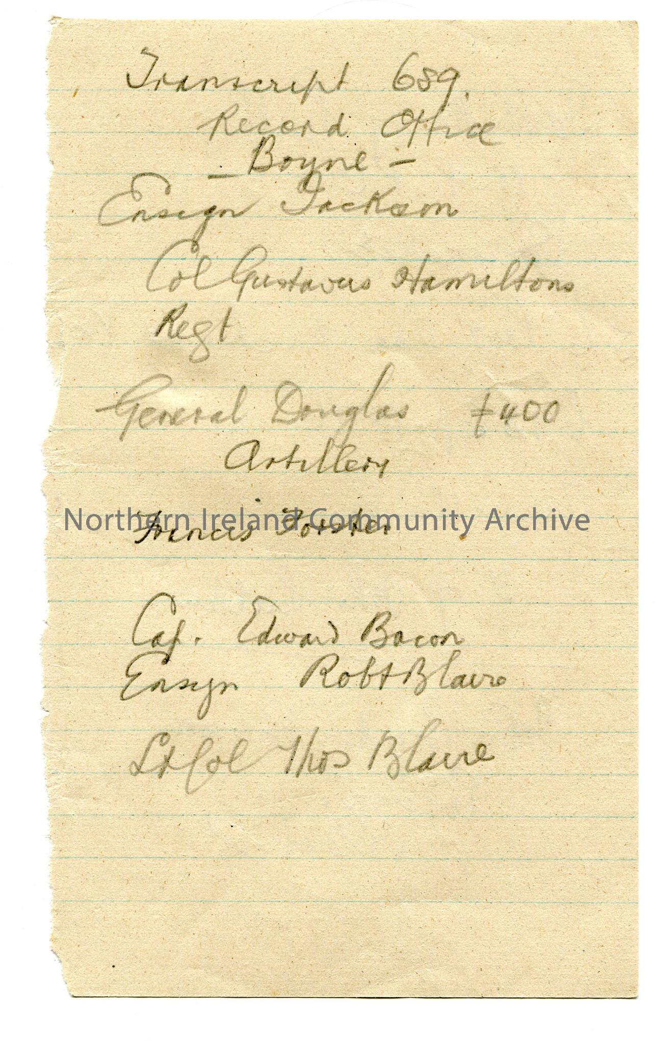 Handwritten notes re various people and their employment or naval/military rank.