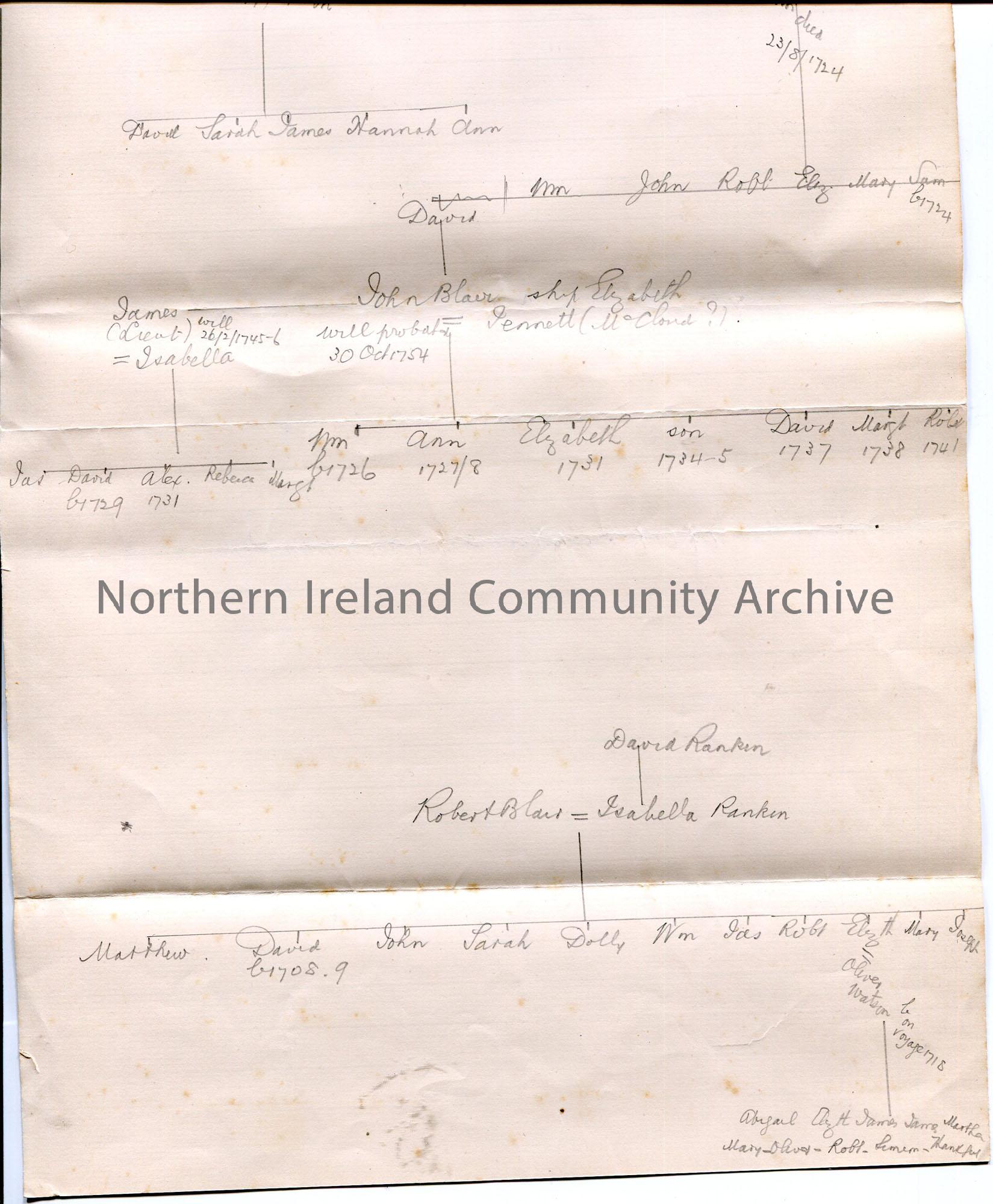 Handwritten notes titled, ‘Bostons Immigrants’. Hand drawn family tree re Blair family. – scan013b