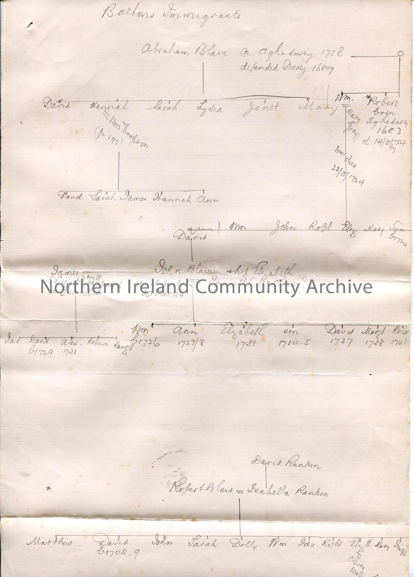 Handwritten notes titled, ‘Bostons Immigrants’. Hand drawn family tree re Blair family.