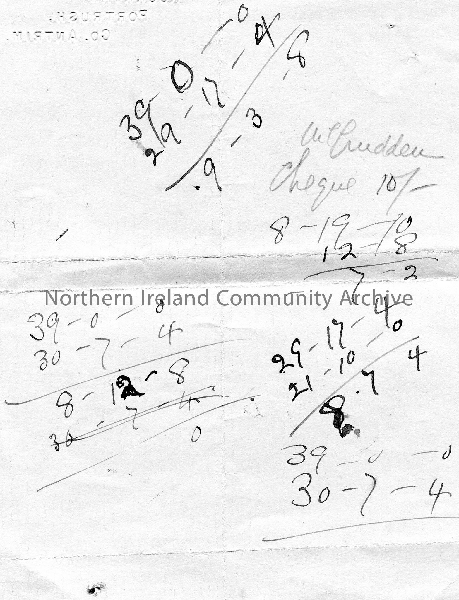 Handwritten on blue/grey paper ‘detailed account of income and expenditure of “Rice Bequest”‘. Rough sums on reverse as well as ‘McCrudden cheque’. – scan220b