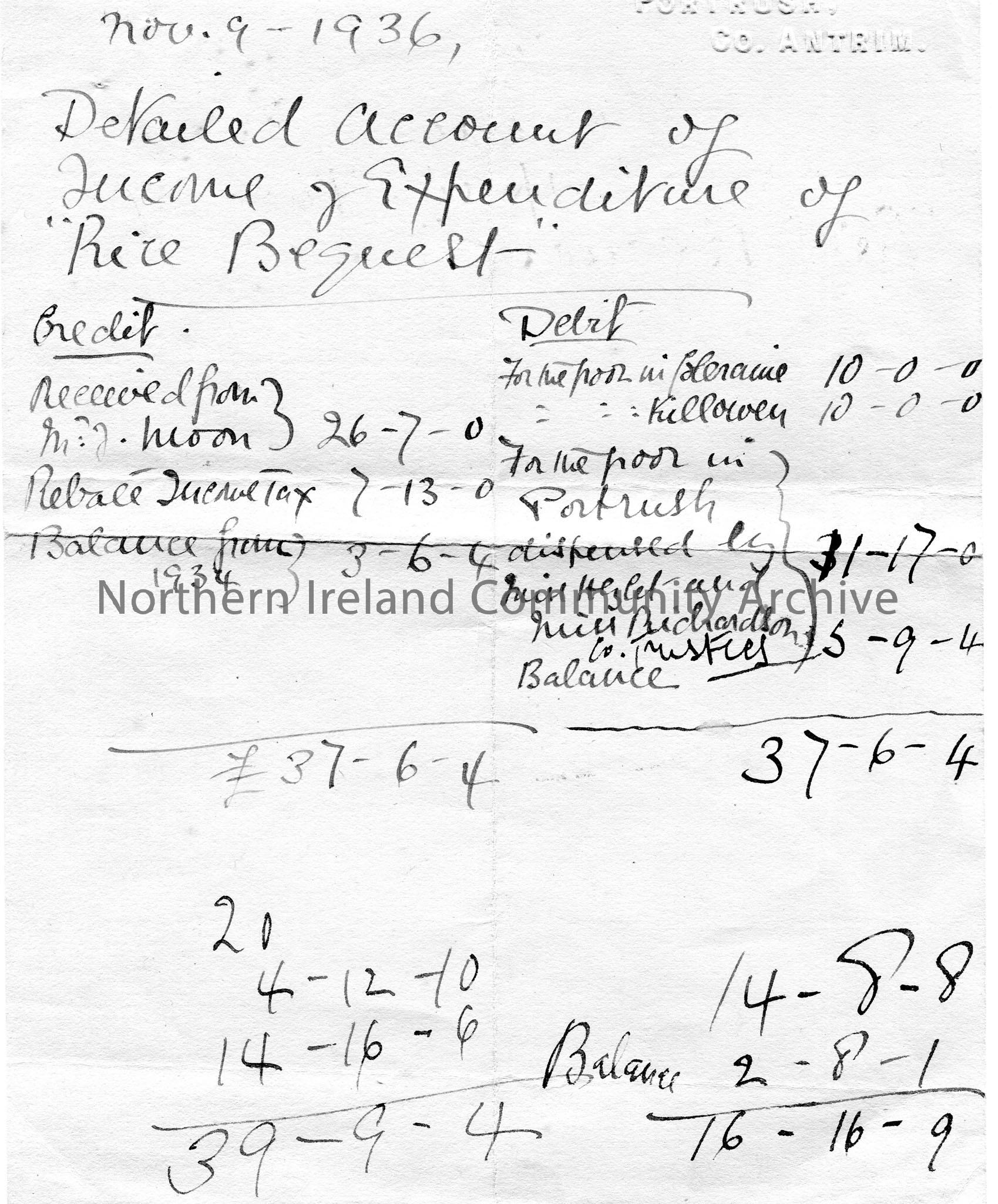 Handwritten on blue/grey paper ‘detailed account of income and expenditure of “Rice Bequest”‘. Rough sums on reverse as well as ‘McCrudden cheque’.