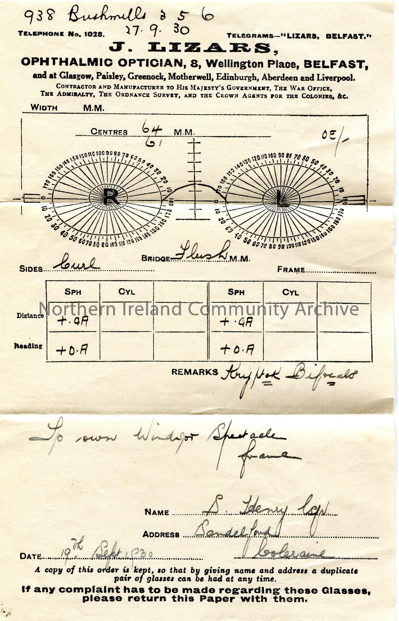 Handwritten order for glasses for Sam Henry. Measurements for glasses – bifocals. Notes – ‘To own Windsor Spectacle frame’. ‘938 Bushmills 3 5 6, 27.9…