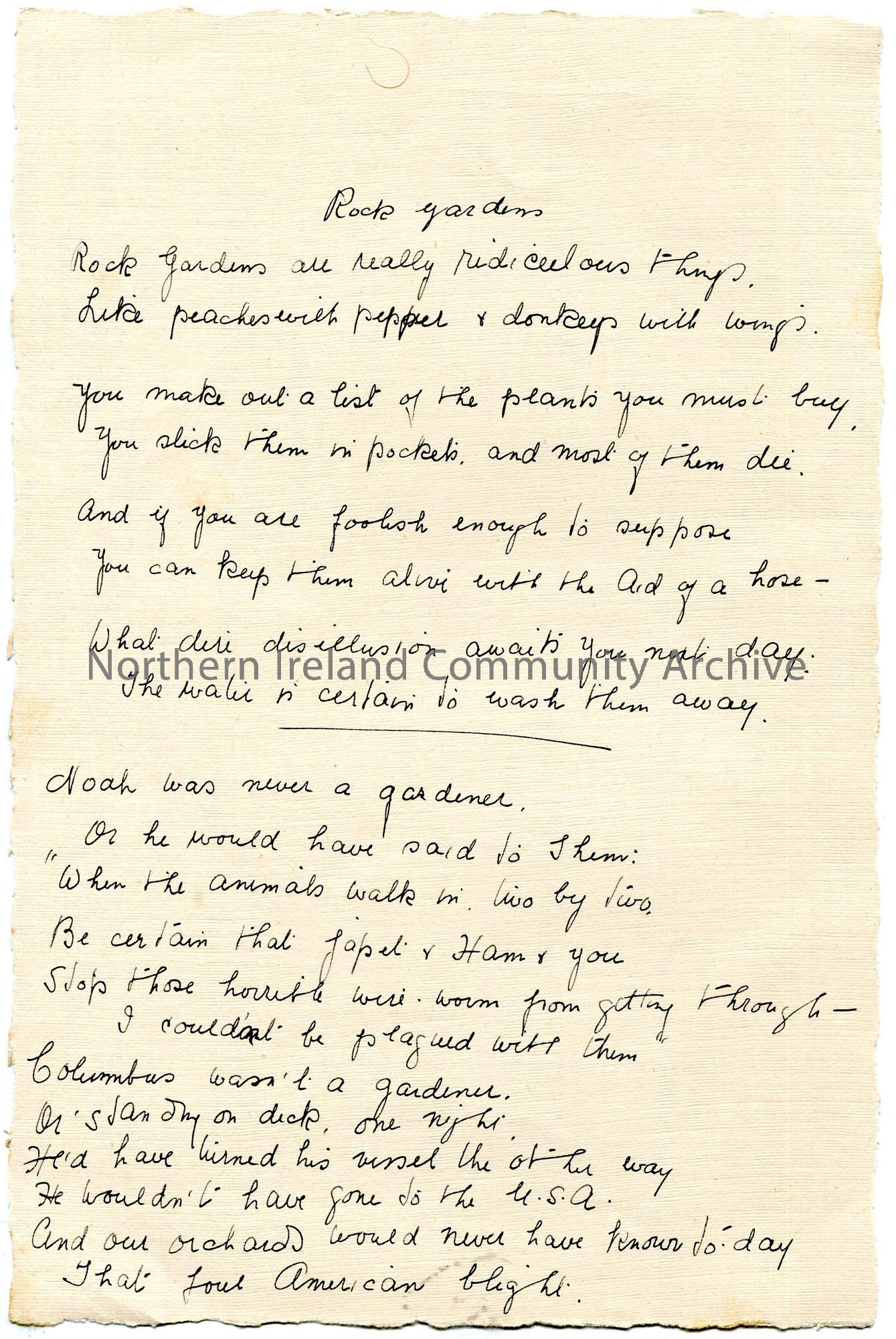 Handwritten page (double sided) of words to poems or songs. They are titled, ‘Table Flowers’, ‘Tradegy at Kew’, ‘Spring’ and ‘Rock Gardens’. – scan051b