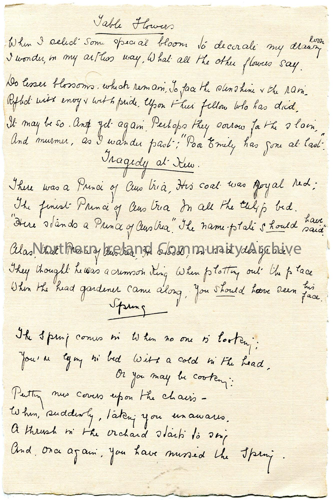 Handwritten page (double sided) of words to poems or songs. They are titled, ‘Table Flowers’, ‘Tradegy at Kew’, ‘Spring’ and ‘Rock Gardens’.