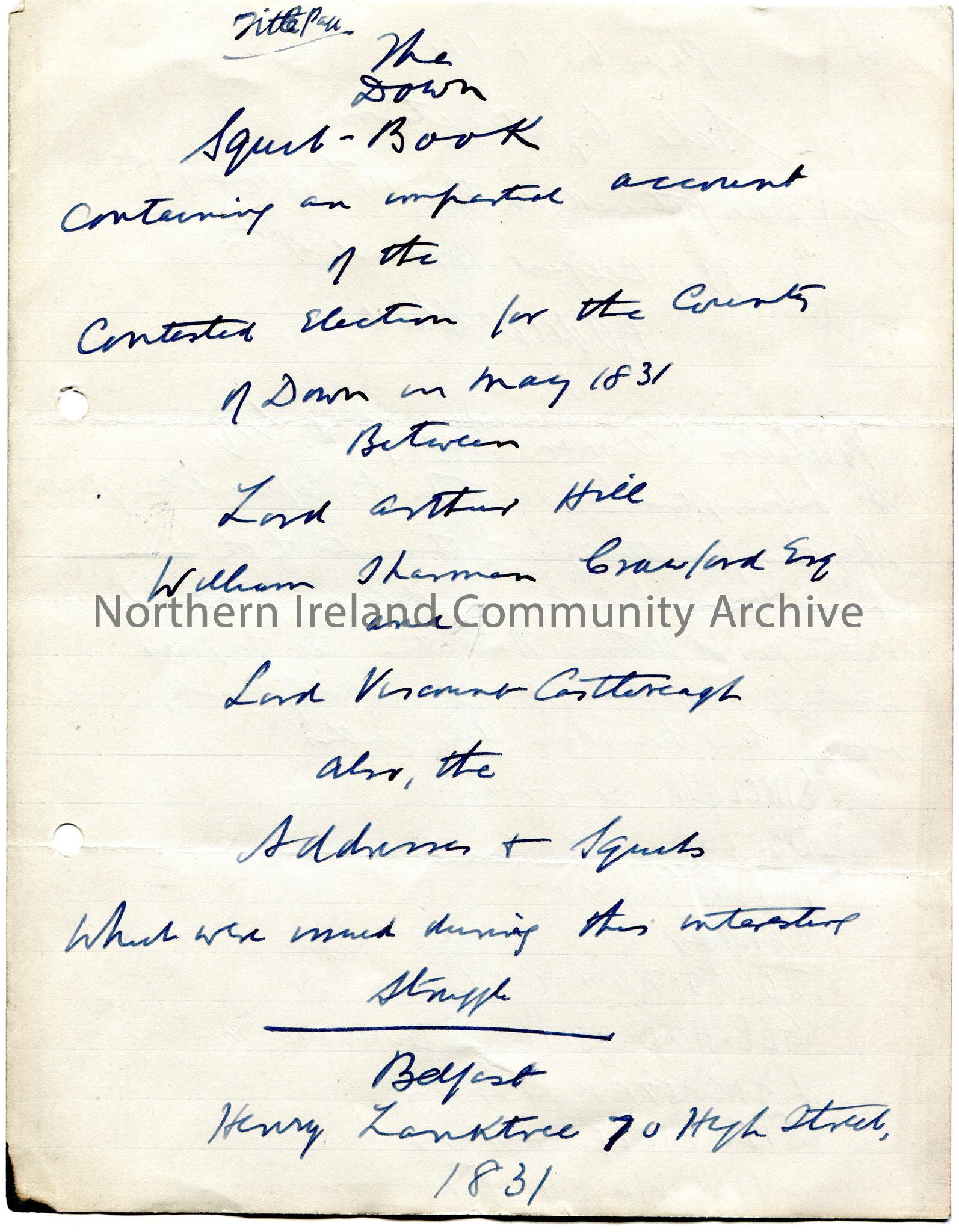 Handwritten page of notes, double sided re The Down Squil? Book. Notes on an election in North Down May 1831. Notes on reverse re auction at Downpatrick 14th May 1931, the Belfast Branch of he Radical Stud.