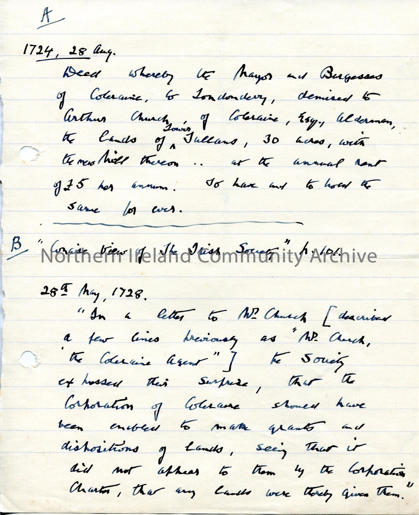 Handwritten page of notes re surname Church. Refers to the renting and giving of land in Coleraine. Dated 1724 and 1728. Handwritten by Wilfrid Abbott…