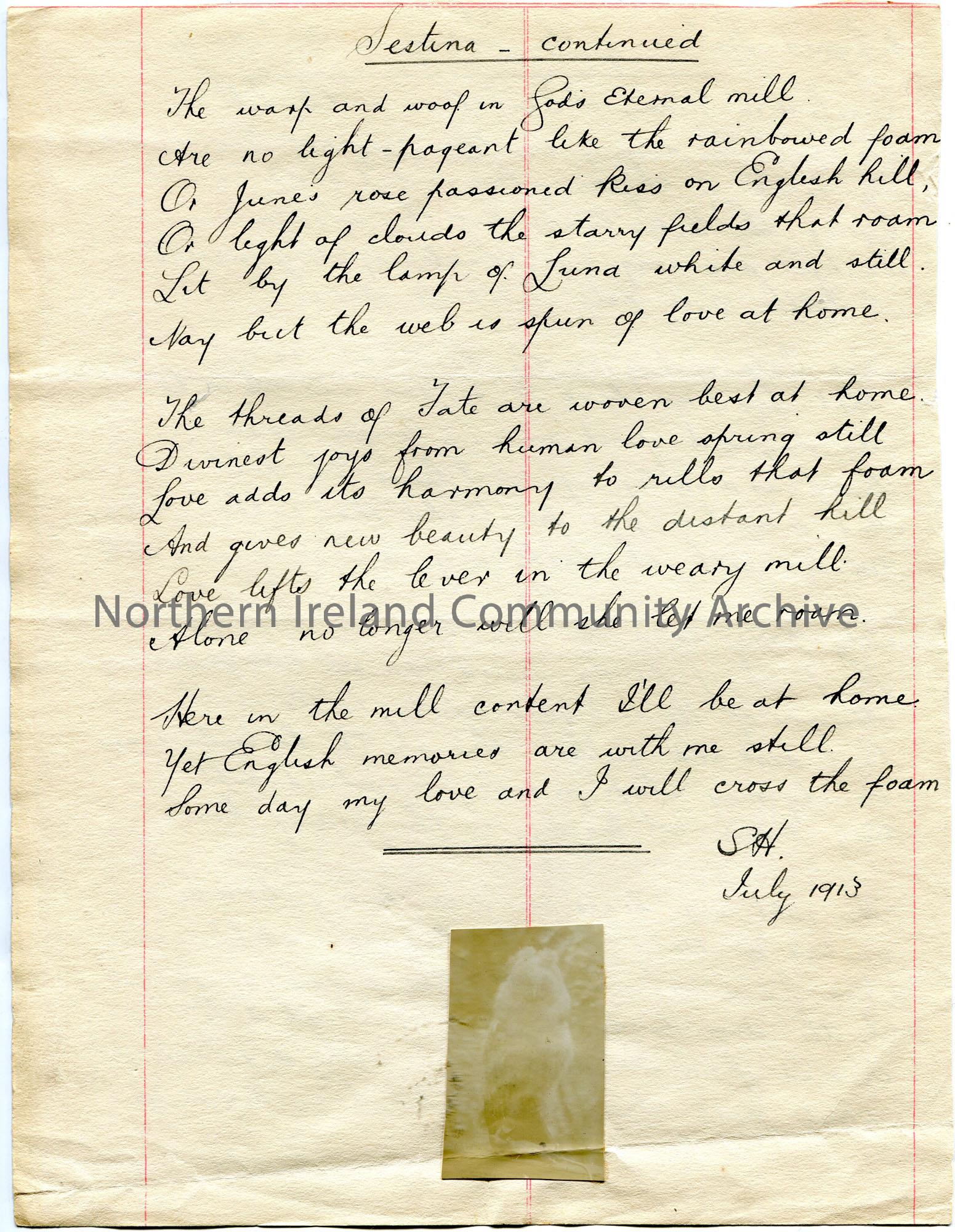 Handwritten poem by Sam Henry (double sided) titled, 'Rhymed Sestina of the End of a Holiday'. Re a holiday in England in June. Mentions a mill and foam throughout. Initialled, 'SH. July 1913' at end of poem.