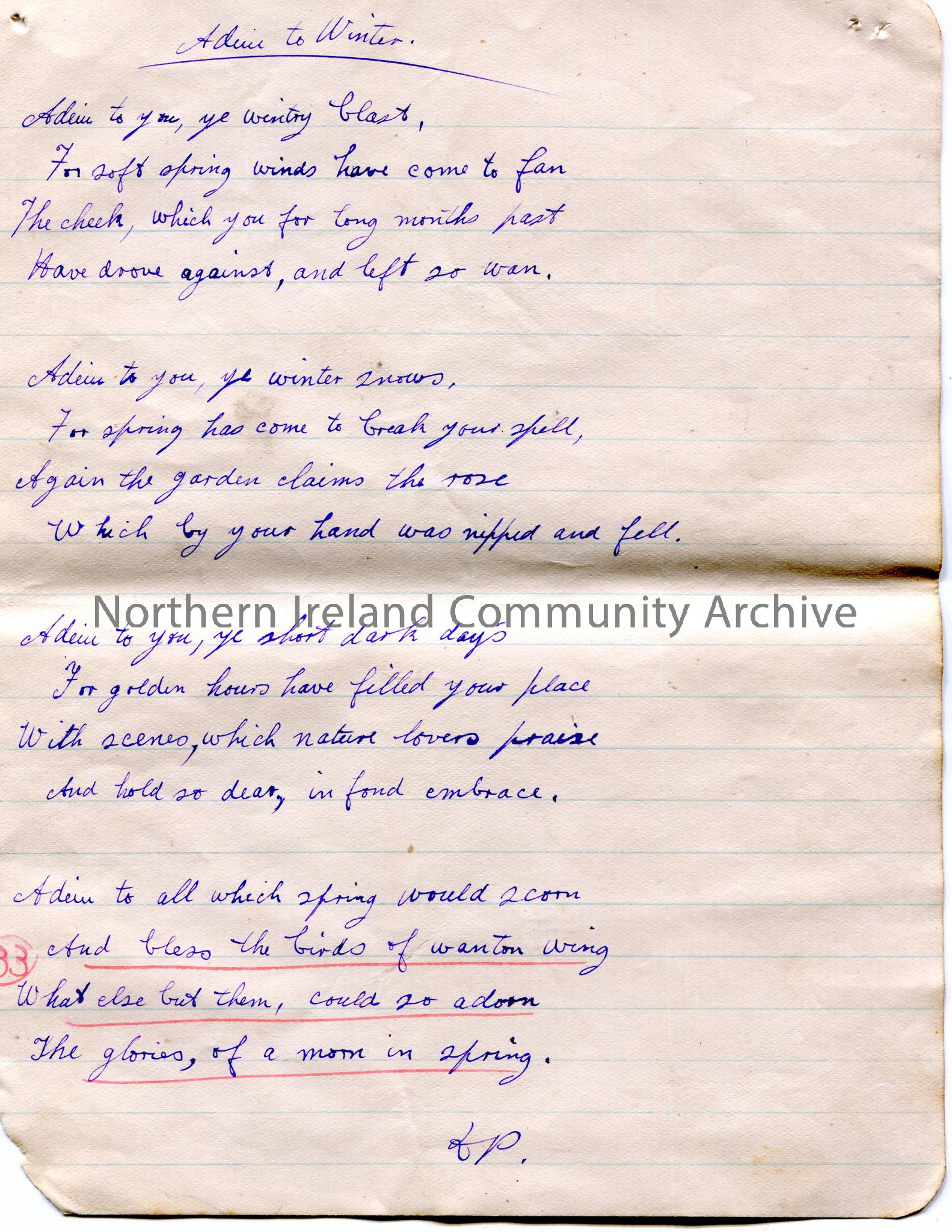 Handwritten poem or words to song on lined paper titled, ‘Advice to Winter’. Some lines are underlined in red with ’33’ written beside them. Initialle…