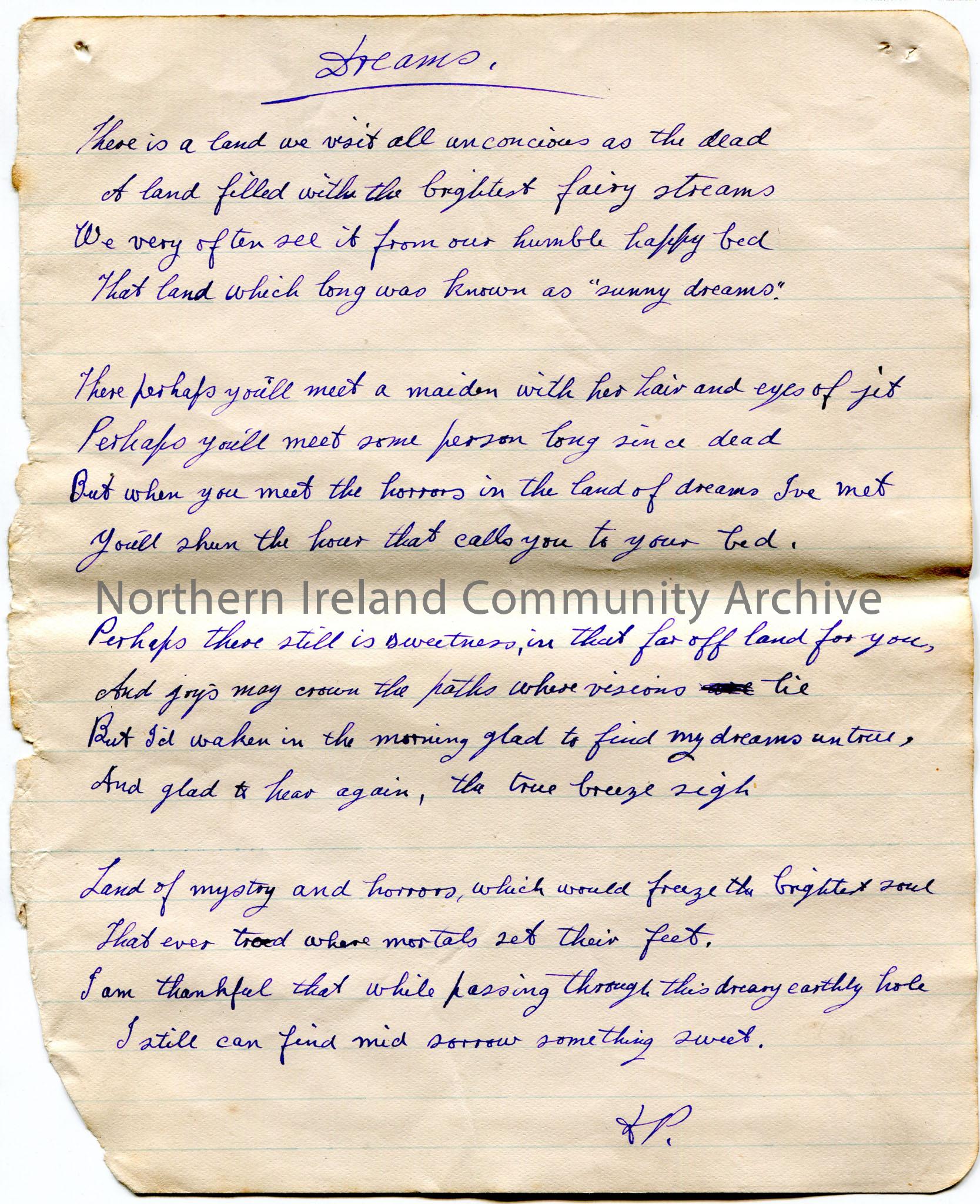 Handwritten poem or words to song on lined paper titled, ‘Dreams’. Initialled D.P.