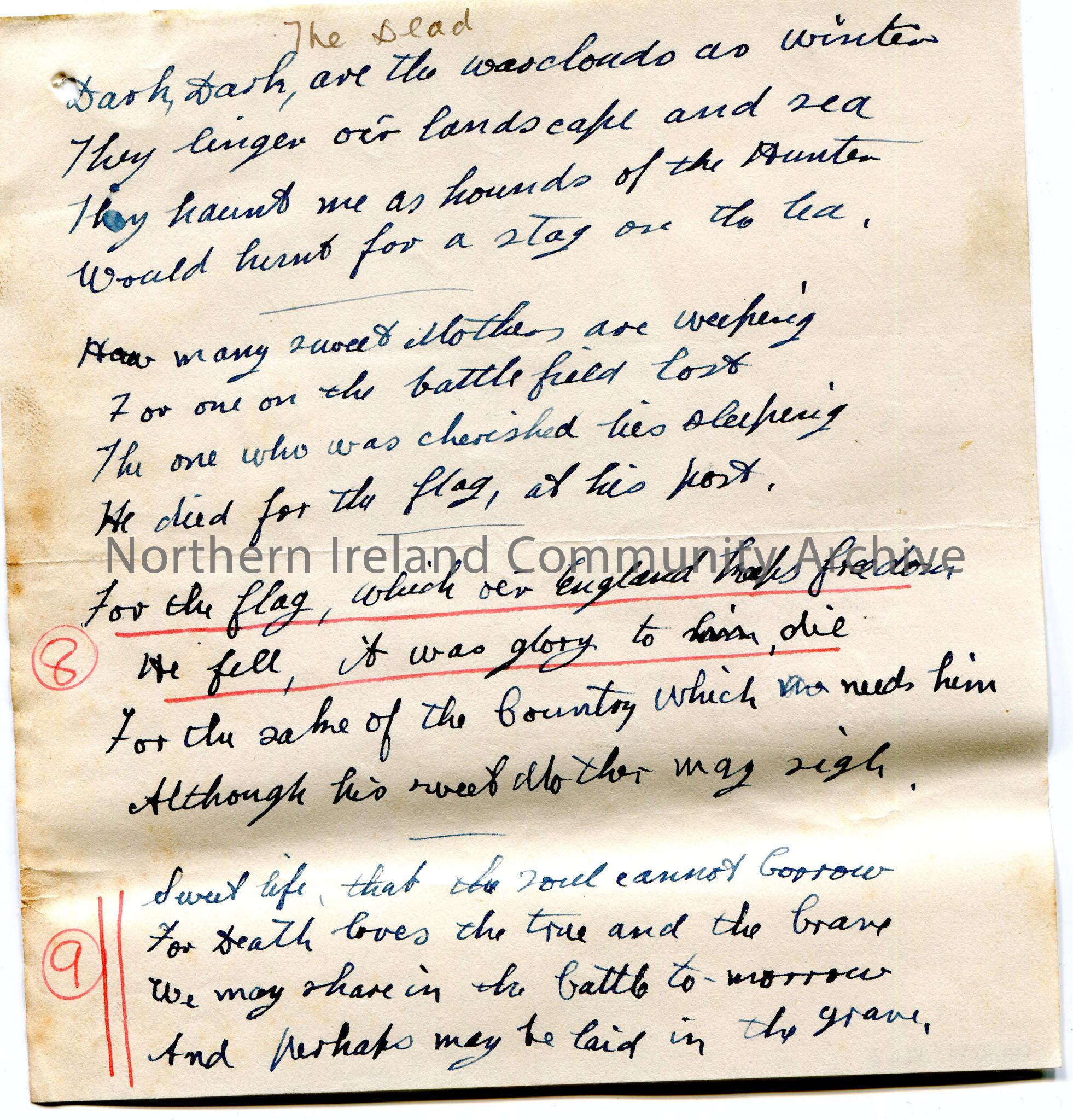 Handwritten poem or words to song on lined paper titled, 'The Dead'. Mentions England. Two lines are underlined in red and two verses are numbered '8' and '9' in red.