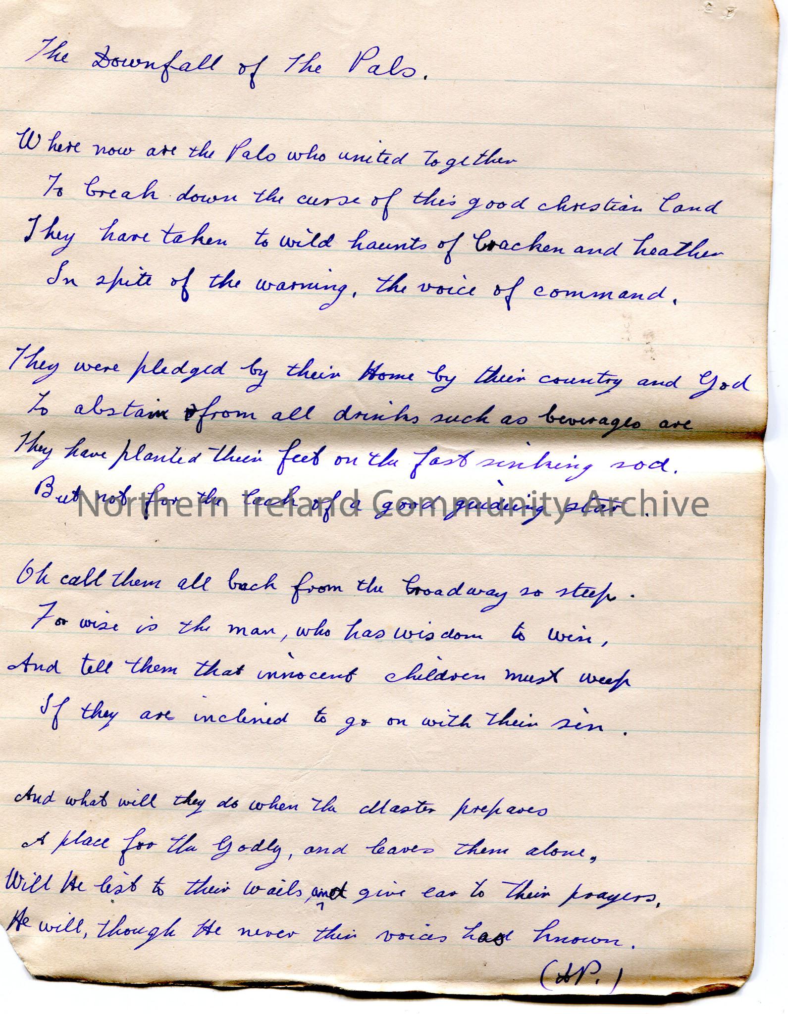 Handwritten poem or words to song on lined paper titled, ‘The Downfall of the Pals’.