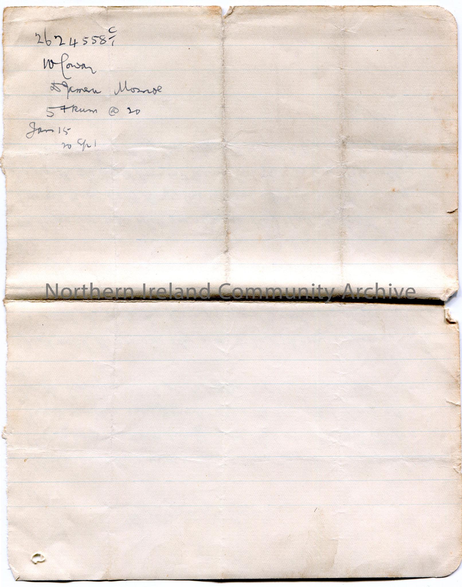 Handwritten poem or words to song on lined paper titled, ‘The Worth of Love’. Initialled D.P. On back of page is handwritten ‘2624558, N? Cowan, … J… – scan095b