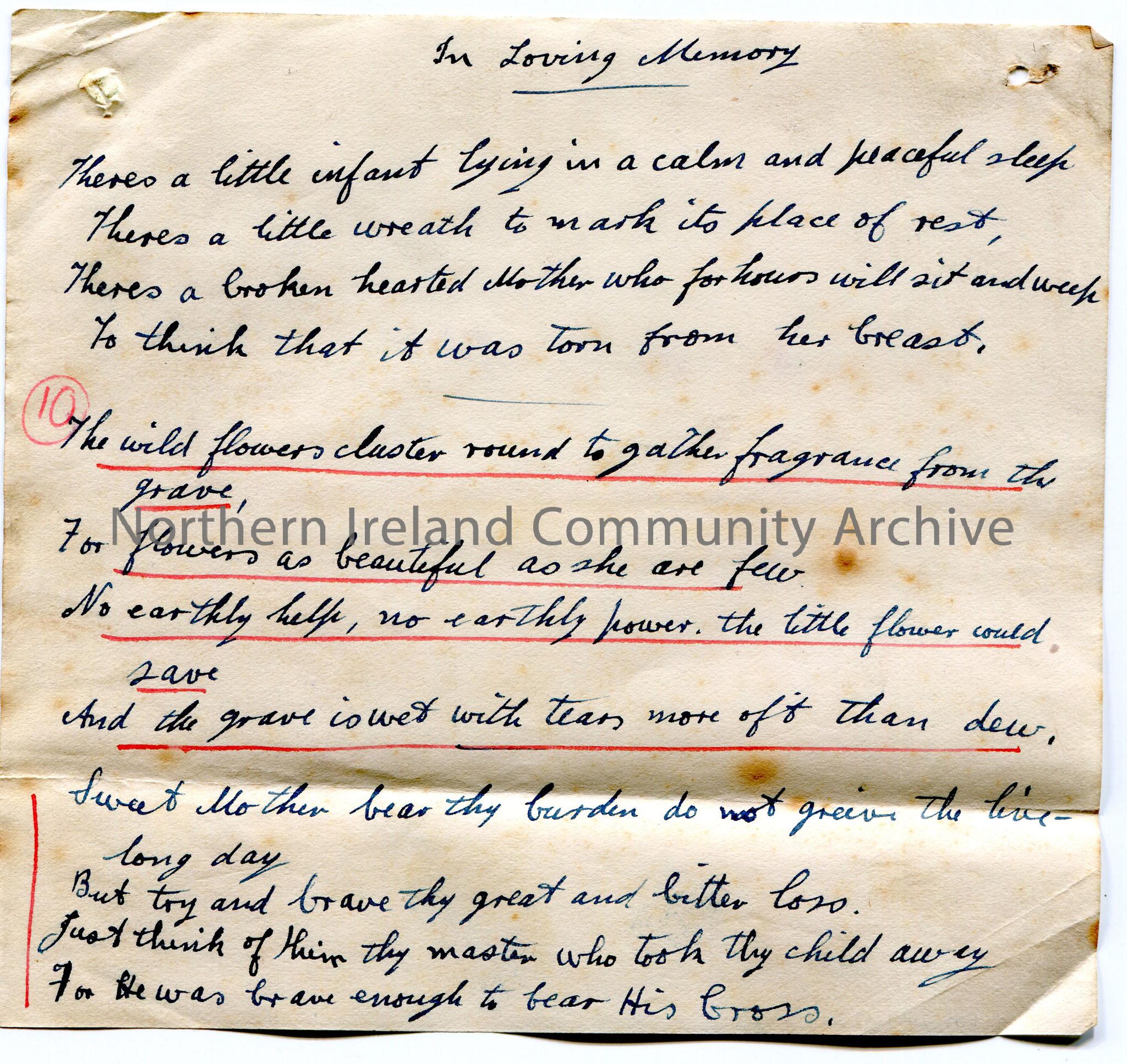 Handwritten poem or words to song titled, ‘In Loving Memory’. Re mother grieving at the grave of her child. Some lines are underlined in red with numb…