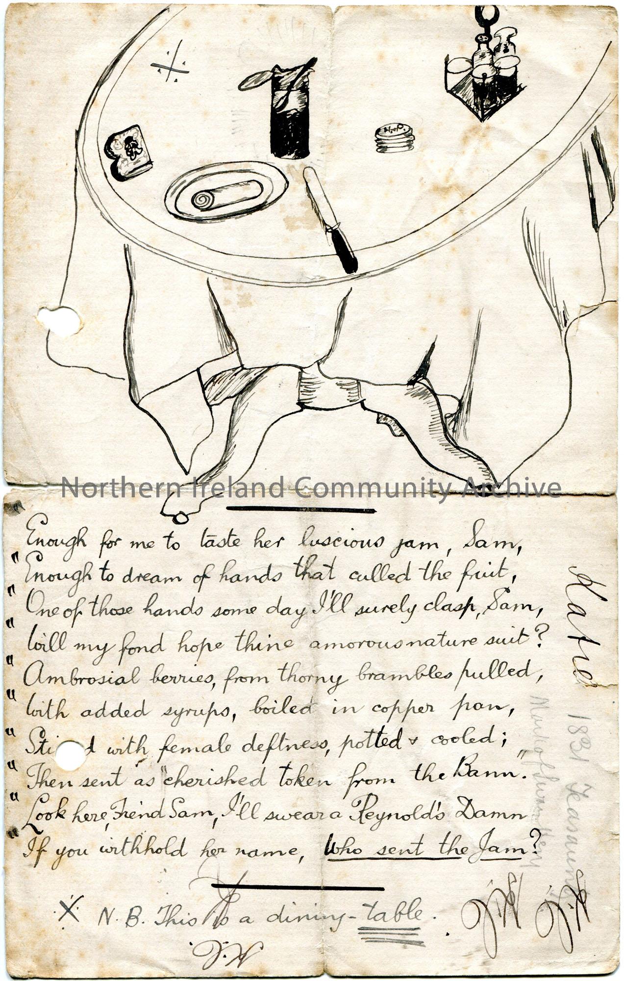 Handwritten poem re jam. Mentions Sam. Features sketch of a table with jam, knife and condiments . Rough notes handwritten along bottom - mentions Katie, 1831 Treasury and initials which are unclear. Rough notes handwritten on back of page - initials and numerical sums.