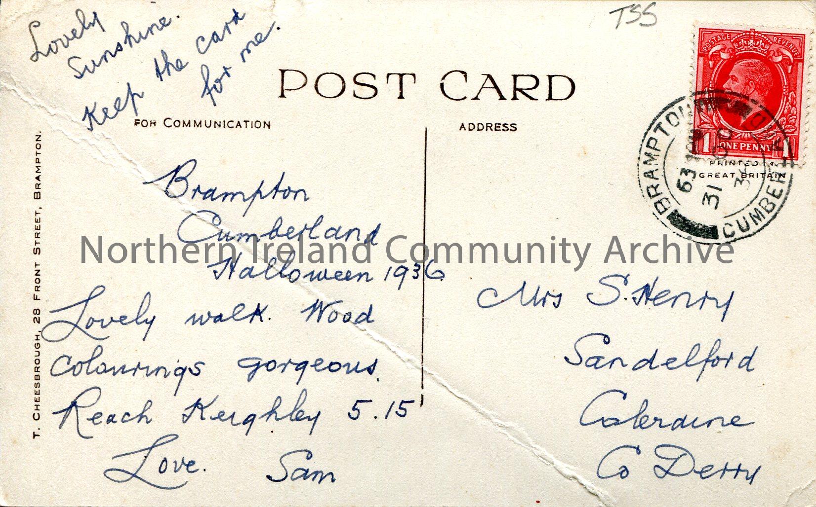 Handwritten post card to Mrs S. Henry from Sam. Halloween, 1936. Writing from Brampton, Cumberland. Features an image of Lanercost Abbey and Gateway, … – T55b