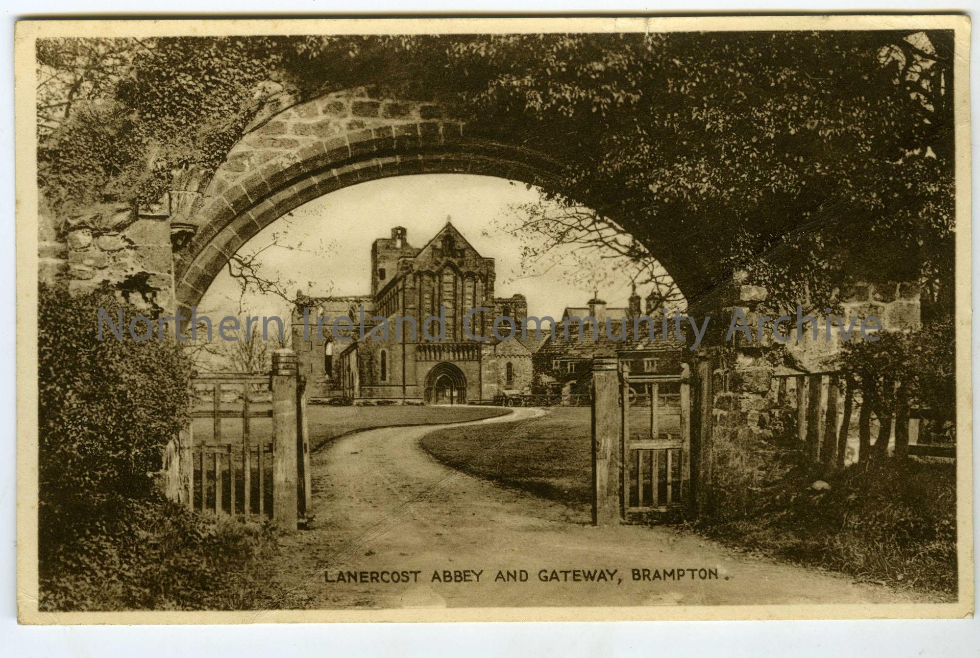 Handwritten post card to Mrs S. Henry from Sam. Halloween, 1936. Writing from Brampton, Cumberland. Features an image of Lanercost Abbey and Gateway, …