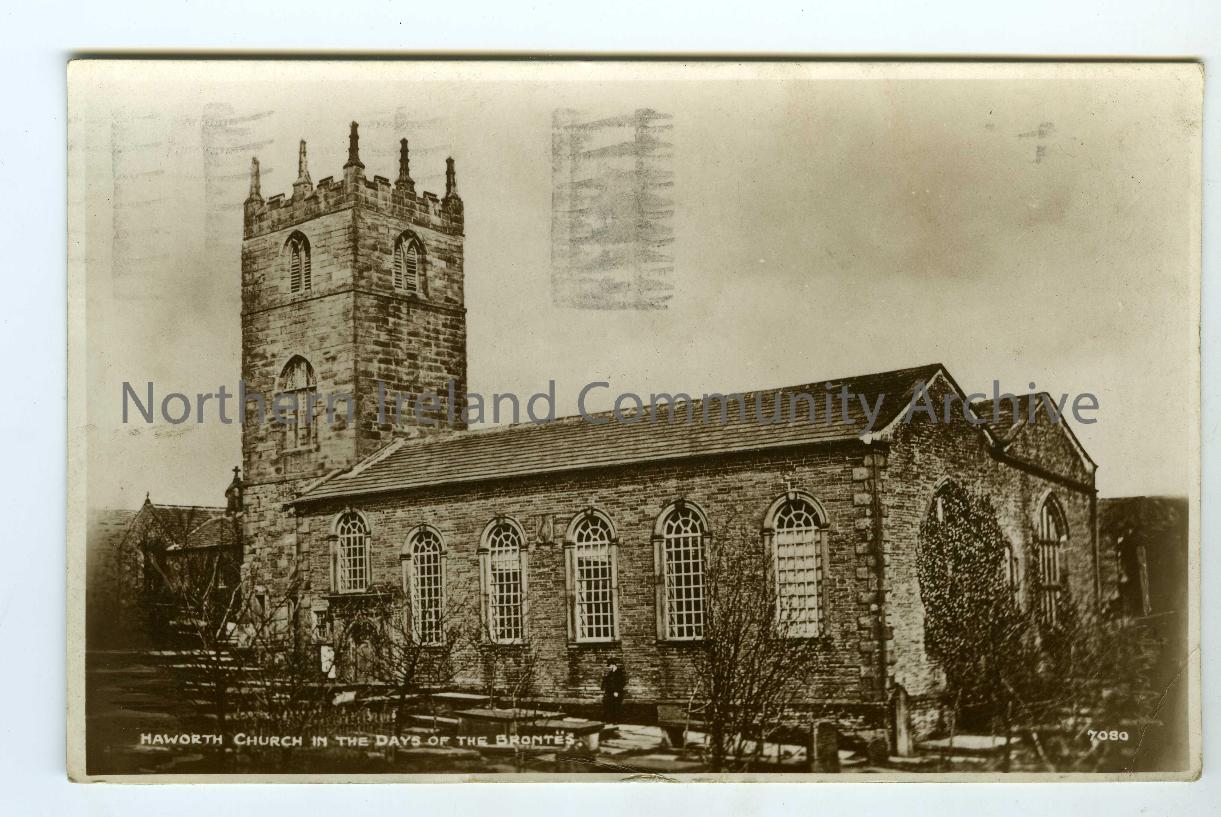 Handwritten post card to Olive Henry from 'Daddy'. 1st November, 1936. Writes 'Seeing Molly & Joan back to school'. Features image of Haworth Church in the Days of the Brontës. Red, one penny, George V postage stamp pasted to corner.