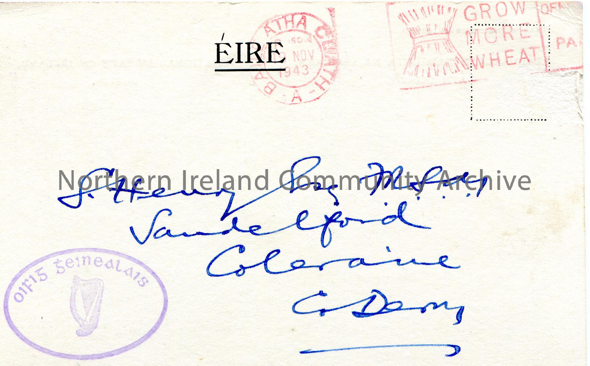 Handwritten postcard addressed to Sam Henry Esq F.R.S.A.I, Sandelford, Coleraine, Co. Derry. ‘Grow More Wheat’ stamped on front. Acknowledging Sam’s l…