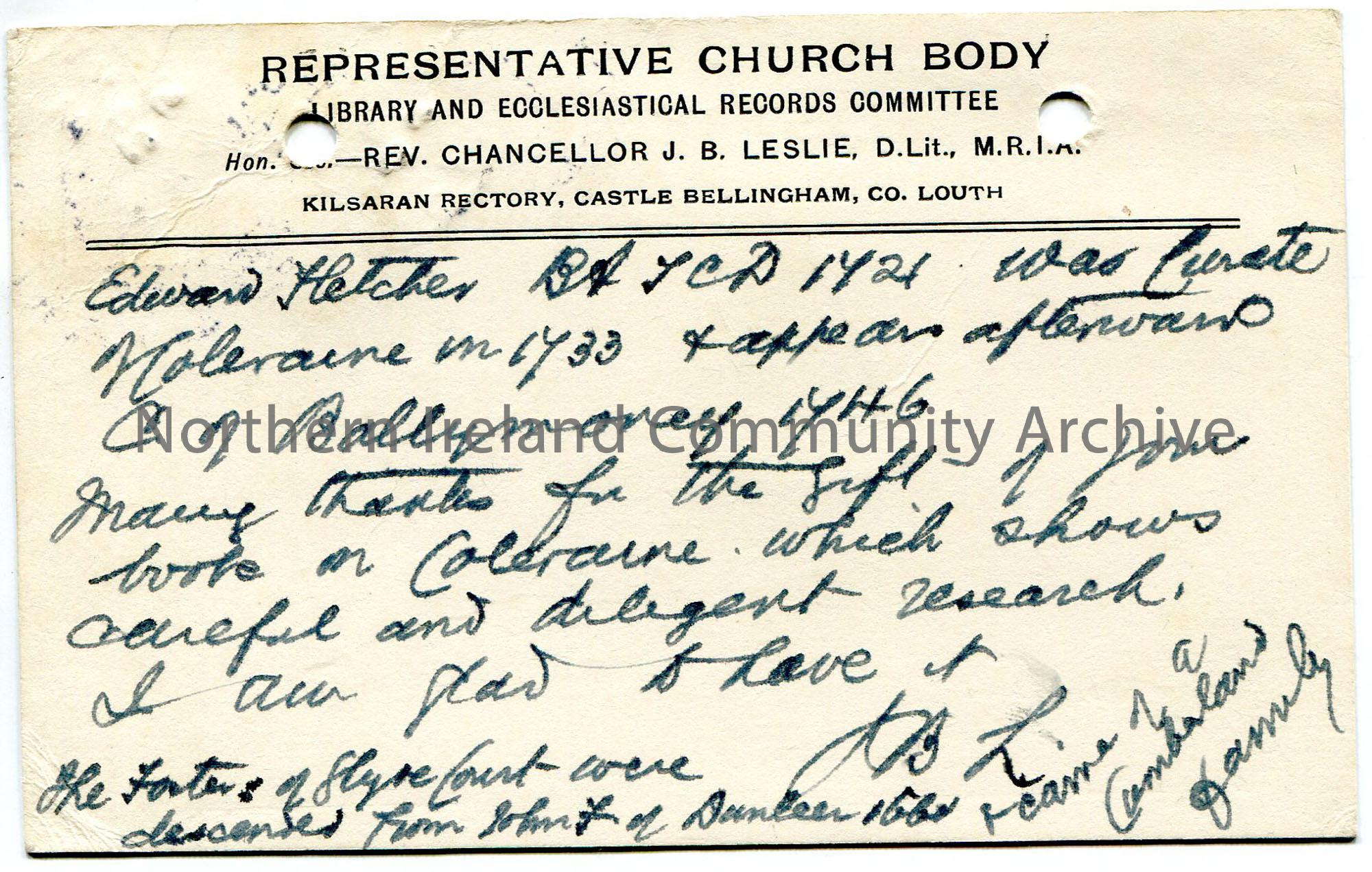 Handwritten postcard addressed to Sam Henry, Esq FRSAI, Sandelford, Coleraine, Co. Derry. One red and one green Eire postage stamps on front. Writing re Edward Fletcher, Curate of Coleraine in 1733 and Ballymoney in 1746. Thanks Sam for sending his book on Coleraine.