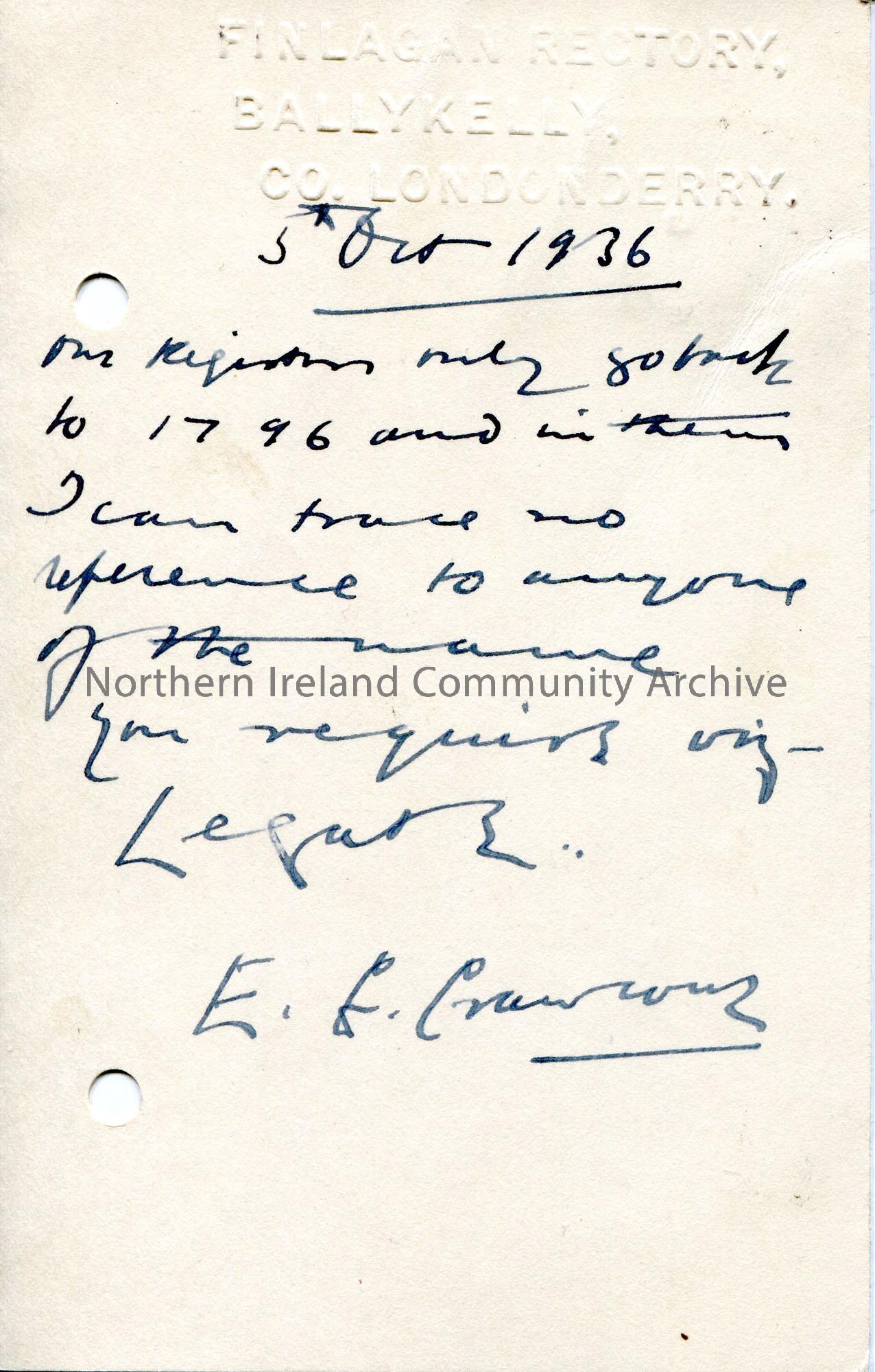 Handwritten postcard addressed to Sam Henry from E ? Crawford. King Edward VIII red 1d postage stamp pasted to front. Carried out a search in the registers for Sam for the surname Legate. Found no results.
