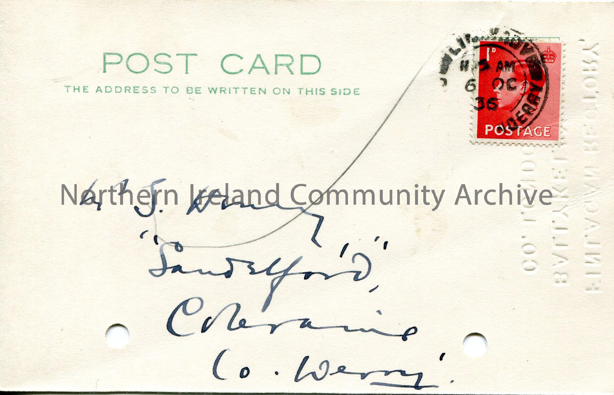 Handwritten postcard addressed to Sam Henry from E ? Crawford. King Edward VIII red 1d postage stamp pasted to front. Carried out a search in the registers for Sam for the surname Legate. Found no results.